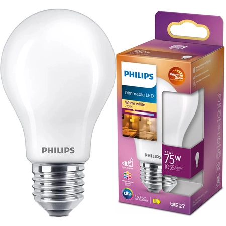 Moderní LED žárovka PHILIPS 7,2W s funkcí stmívání WarmGlow pro každodenní použití v interiéru. Umožňuje snížit spotřebu energie a snížit frekvenci výměny žárovek, čímž zajišťuje vysokou kvalitu světla. Standardní žárovka z opálového skla, stmívatelná, se závitem E27, 15 000 hodin provozu a světelný tok 1 055 lumenů. Výkon svítilny odpovídá svitu 75W žárovky.