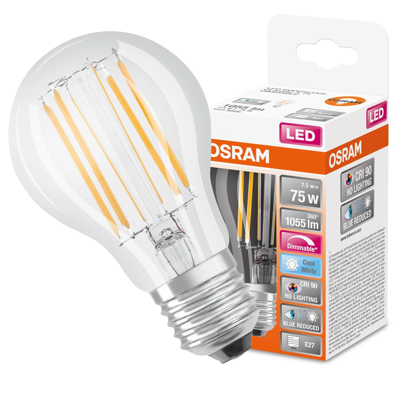 LED žárovka E27 A60 7,5W = 75W 1055lm 4000K Neutrální 300° CRI90 Stmívatelné vlákno OSRAM SUPER STAR+