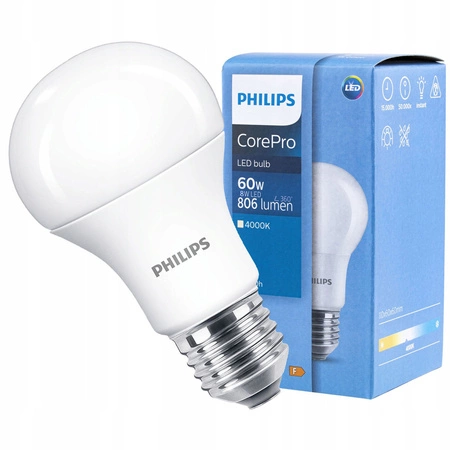Žárovka CorePro LED od renomované a uznávané společnosti PHILIPS s paticí E27 a příkonem 8 W (odpovídá klasické 60W žárovce) je vysoce kvalitní LED světelný zdroj.