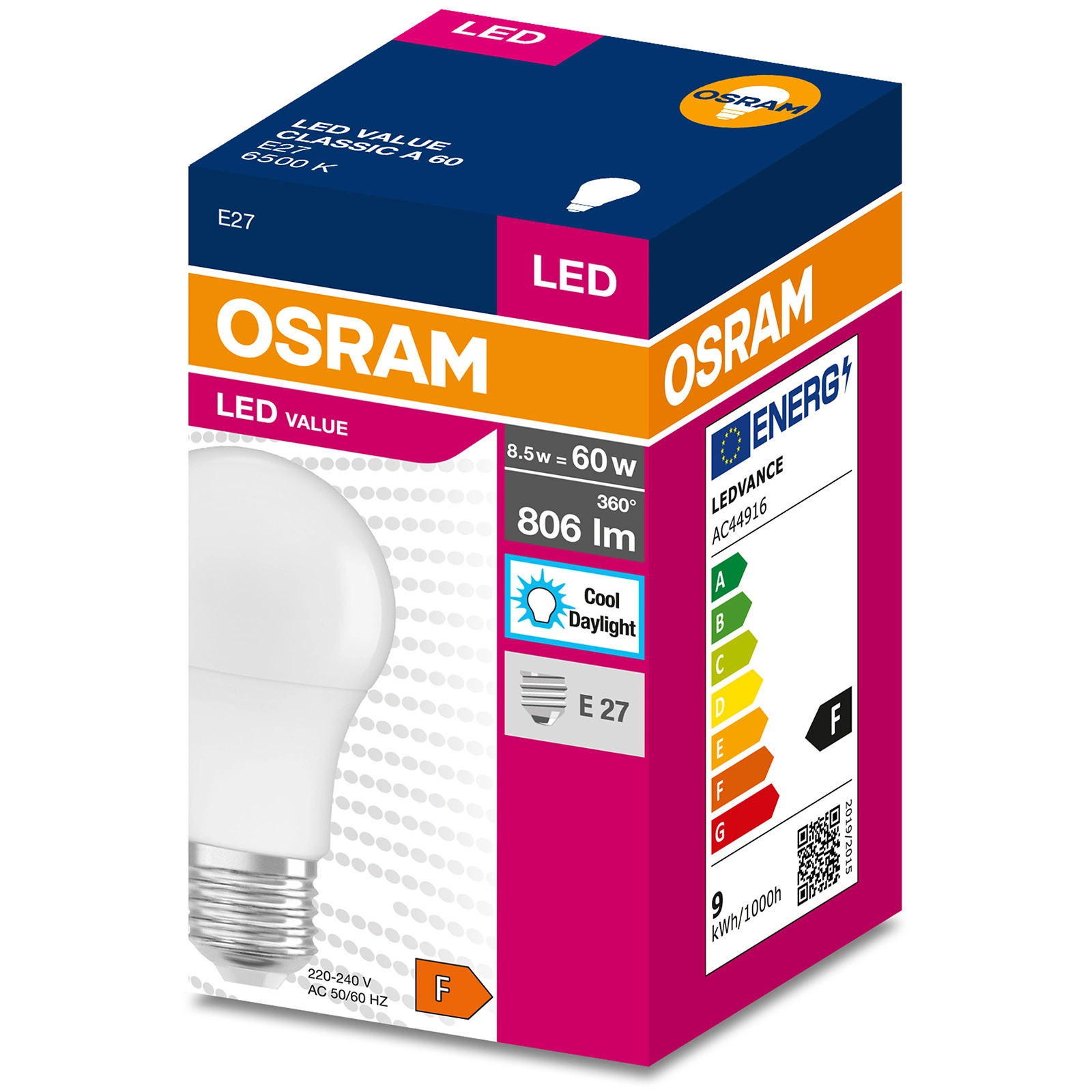 LED žárovka VALUE 9W od renomované a uznávané firmy OSRAM s paticí E27 a výkonem 8,5W (odpovídá klasické 60W žárovce ) je kvalitní LED světelný zdroj. Žárovka je vyrobena pomocí moderních řešení využívajících inovativní LED technologie , které se vyznačují vysokou účinností světelných parametrů, věrnou reprodukcí barev osvětlovaných předmětů a výjimečně dlouhou životností.