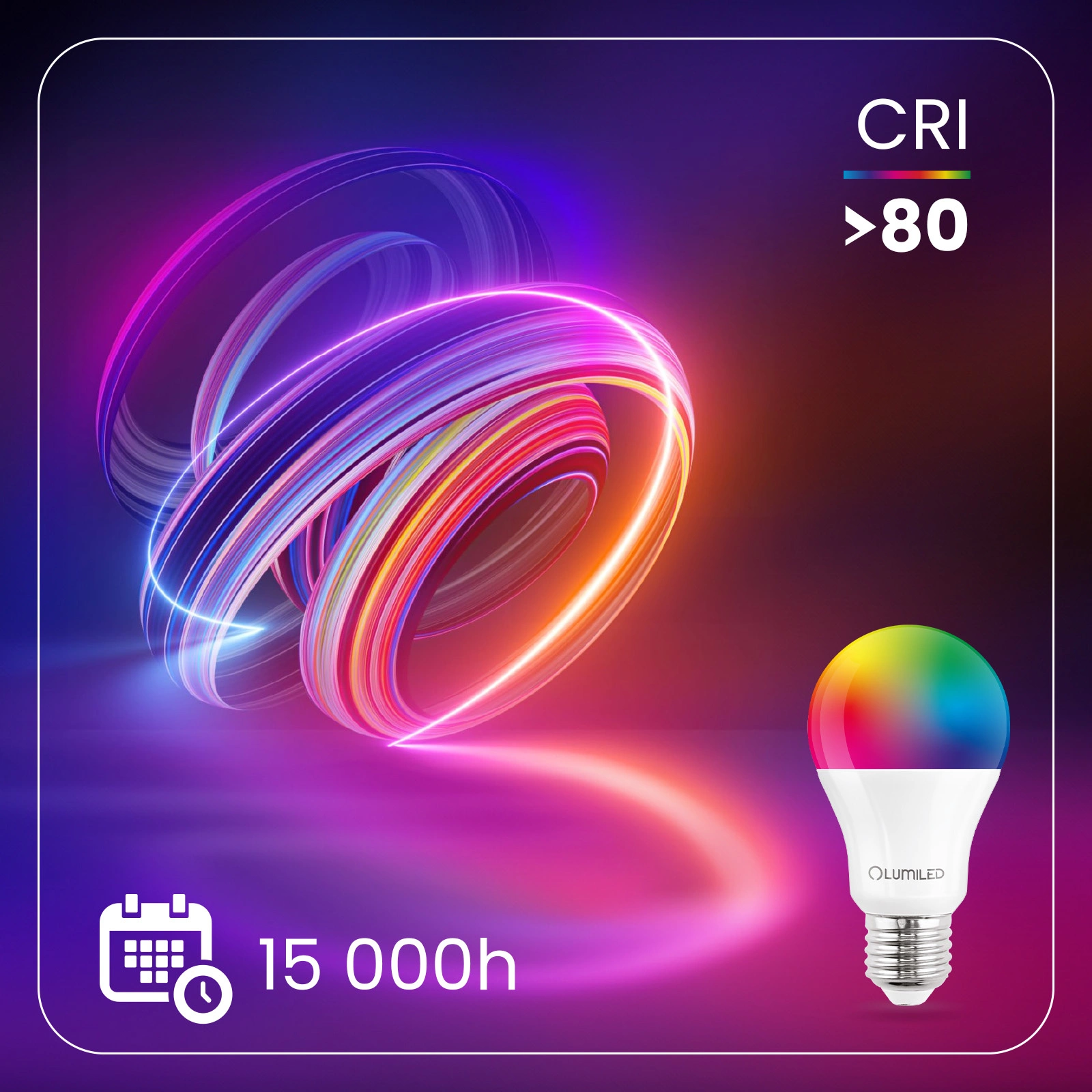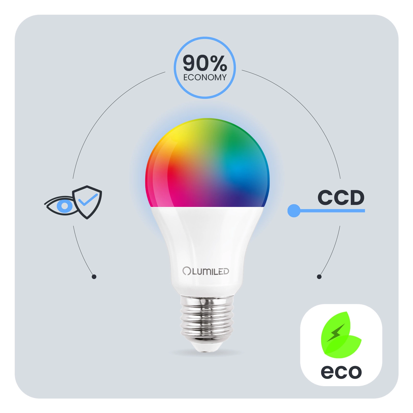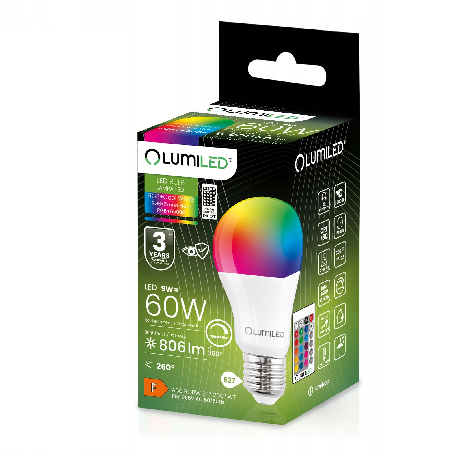 Inteligentní žárovka LED RGBW od společnosti LUMILED s paticí E27 s výkonem 9 W a světelným tokem 806 lm.