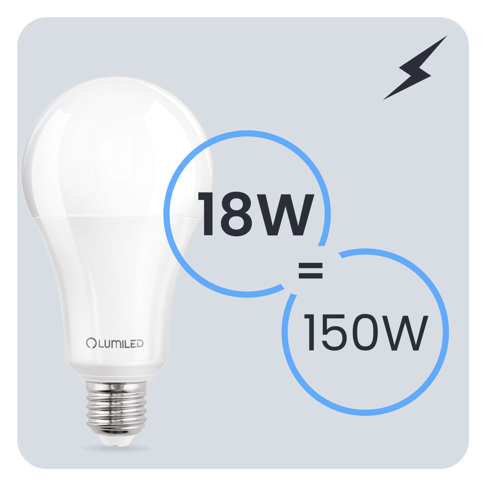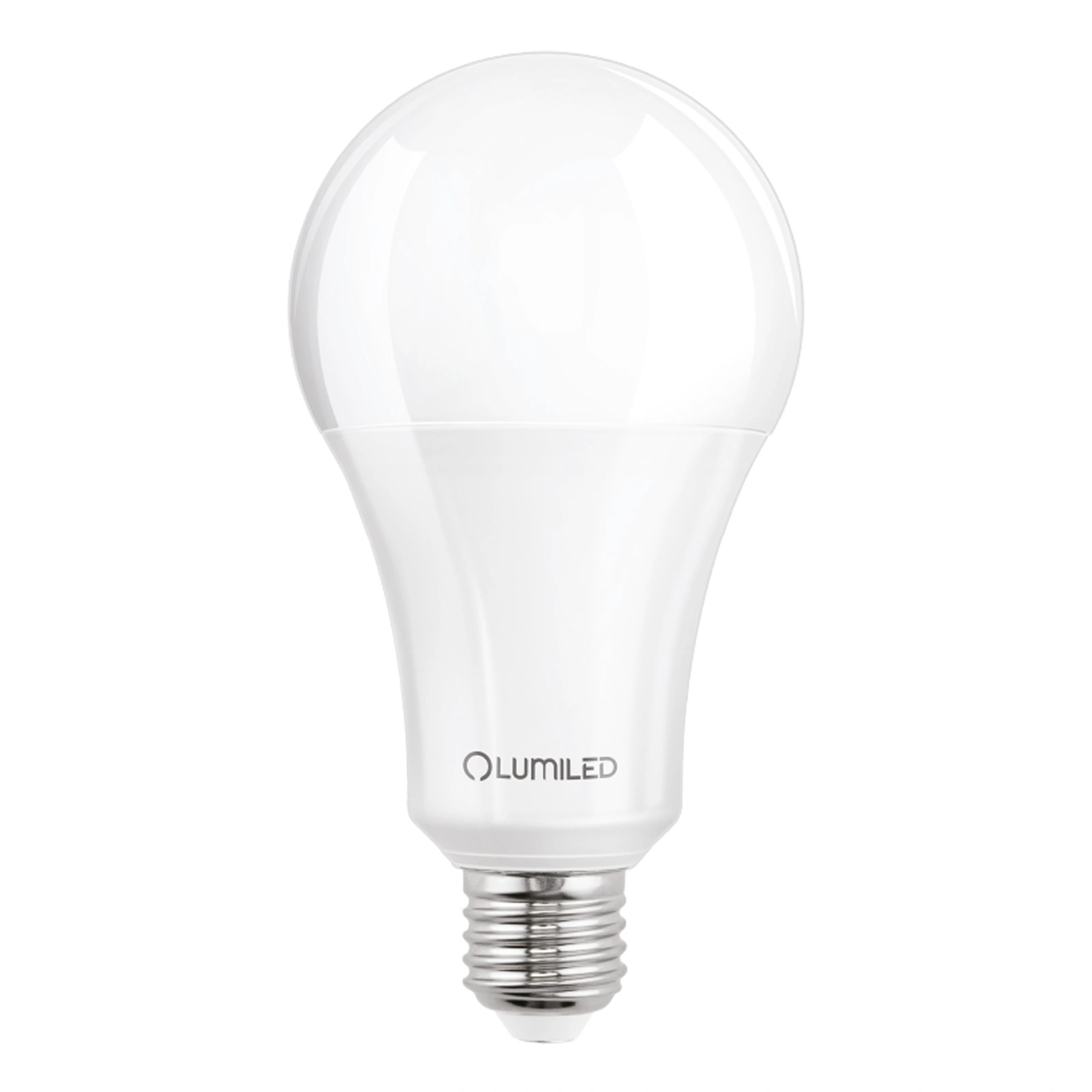 18W LED žárovka Lumiled je skvělou volbou pro ty, kteří potřebují velmi jasné a účinné osvětlení s nízkou spotřebou energie. Vyzařuje studenou barvu světla, která věrně reprodukuje barvy a poskytuje jasnou a příjemnou viditelnost v každém interiéru. Díky standardní patici E27 se snadno vejde do většiny lamp a svítidel. Světelný tok 2430 lm nabízí mimořádně silné a rovnoměrné světlo, srovnatelné s tradiční 150W žárovkou, a široký úhel 260° účinně osvětluje celou místnost, čímž eliminuje stíny a tmavé zóny.