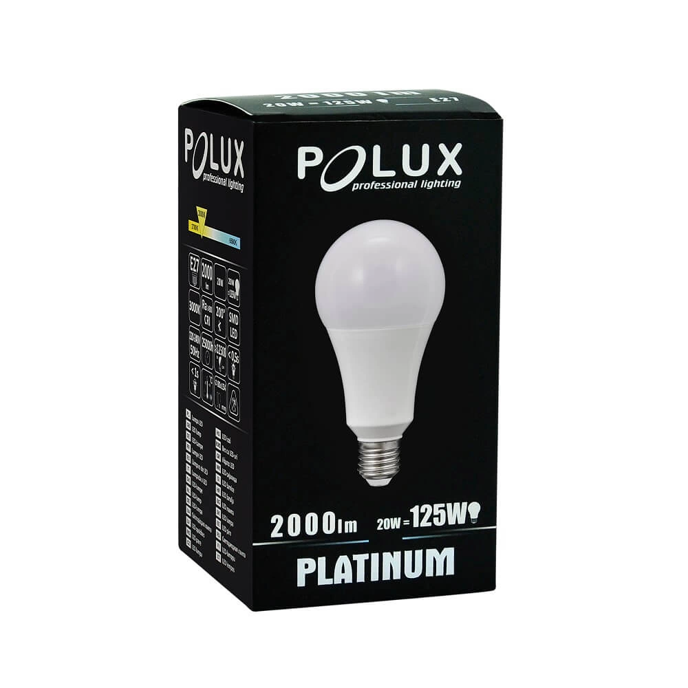 LED žárovka od renomované společnosti POLUX , uznávané v osvětlovacím průmyslu, s paticí E27 a vysokým výkonem 20W (odpovídá klasické 125W žárovce ) je kvalitní LED světelný zdroj se silným světelným tokem 2000lm . Svítidlo je vyrobeno za použití moderních řešení využívajících inovativní LED technologie , které se vyznačují vysokou účinností světelných parametrů, věrnou reprodukcí barev a výjimečně dlouhou životností.