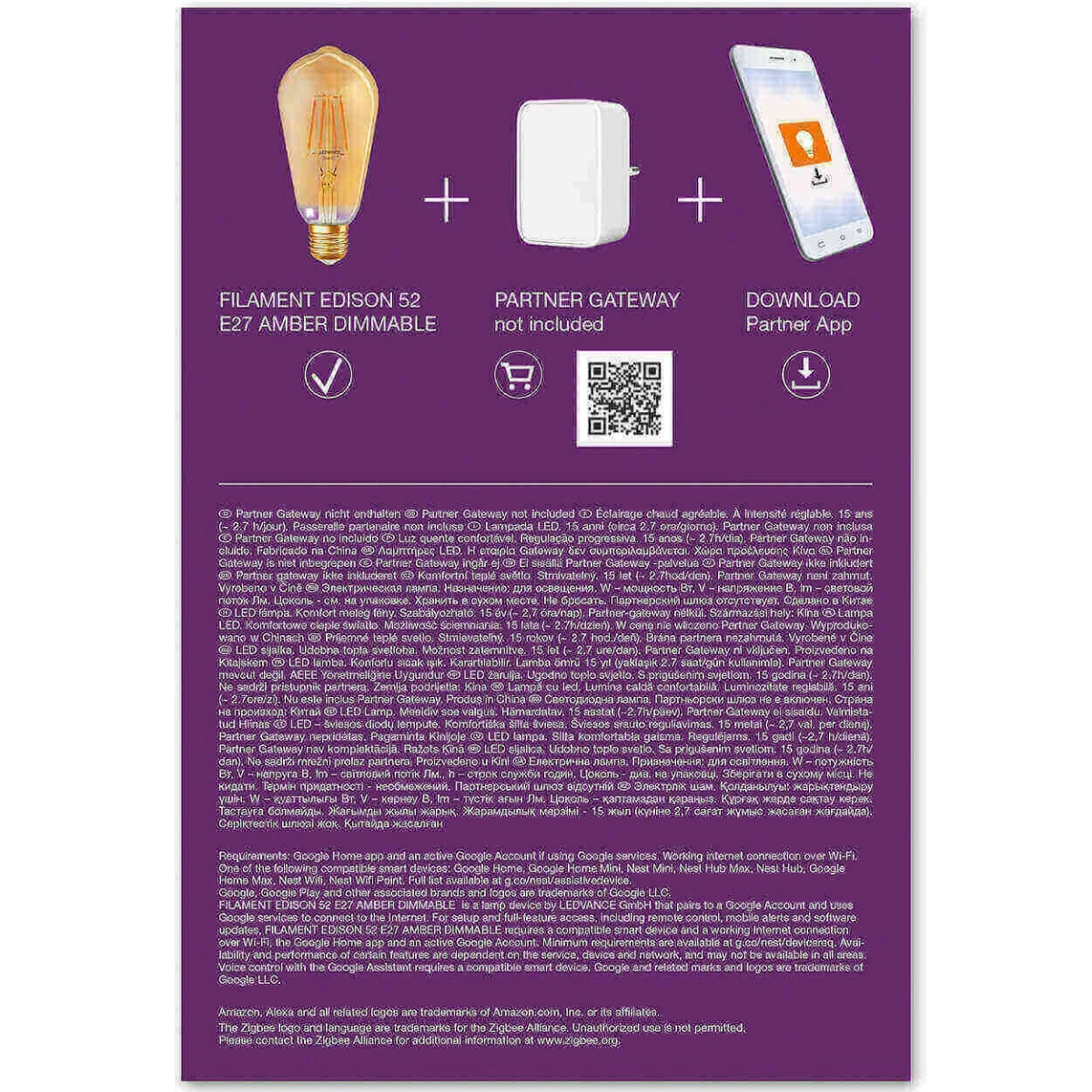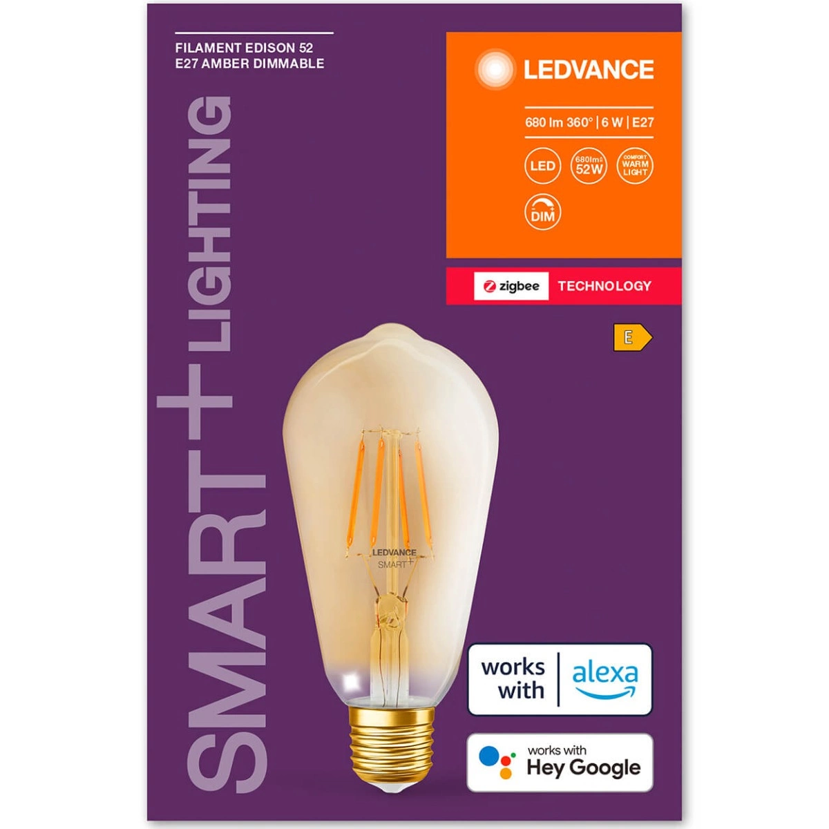 LED žárovka E27 s příkonem 6 W odpovídá tradiční 52W žárovce. Použitá technologie SMART+ s podporou ZigBee usnadňuje ovládání osvětlení a funkce stmívání umožňuje nastavit intenzitu světla podle potřeby. Vyzařuje příjemné, teplé bílé světlo s barevnou teplotou 2400 K a světelným tokem 680 lm.