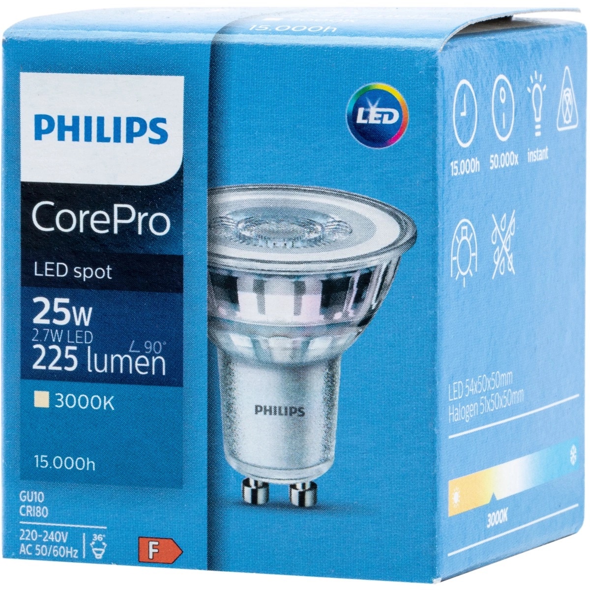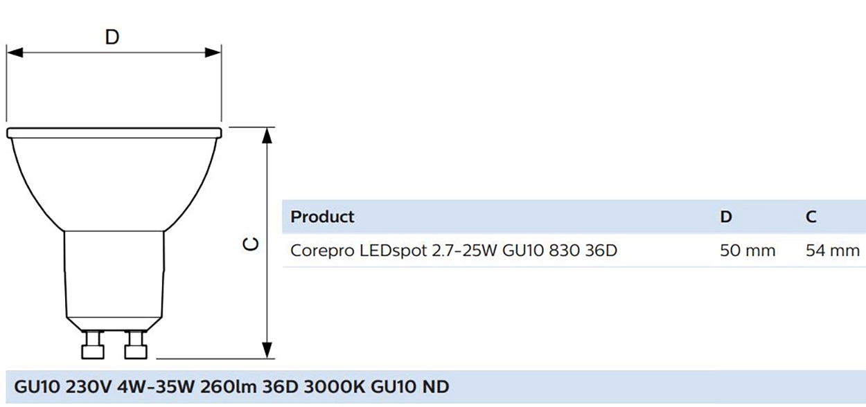 LED žárovka od renomované a v osvětlovací branži uznávané firmy PHILIPS s paticí GU10 a výkonem 2,7W (odpovídá klasické halogenové žárovce o výkonu 25W ) je vysoce kvalitní LED světelný zdroj. Halogenová žárovka byla vyrobena pomocí moderních řešení využívajících inovativní LED technologii , která se vyznačují vysokou účinností světelných parametrů, věrnou reprodukcí barev osvětlovaných předmětů a výjimečně dlouhou životností.