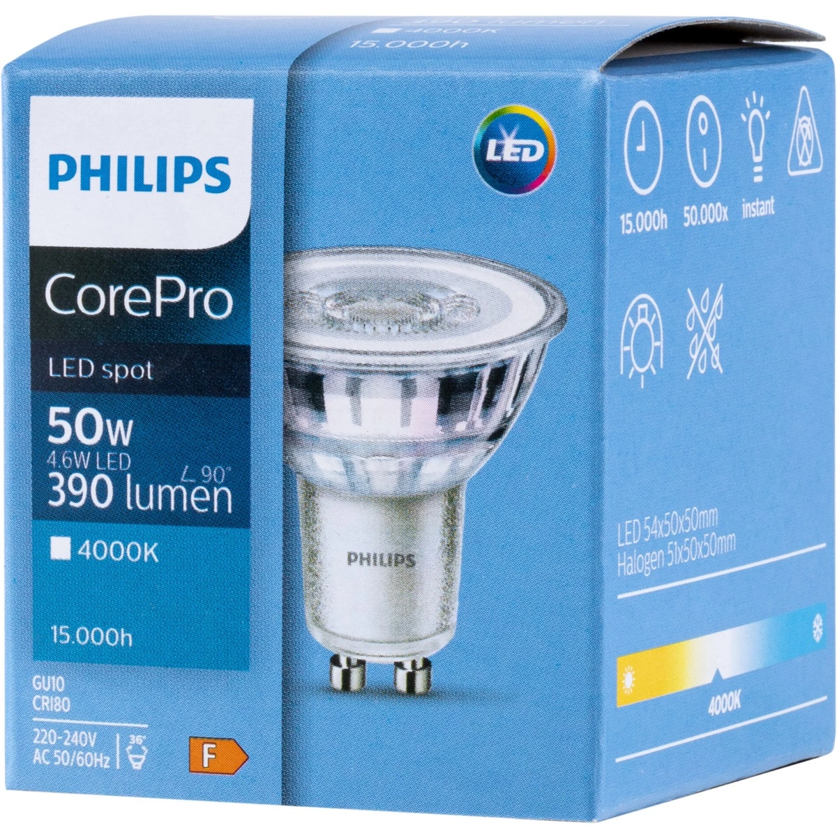 Halogenové žárovky Philips CorePro LED spot 4,6W 4000K ideální pro instalaci bodového i akcentového osvětlení. Jsou navrženy tak, aby napodobovaly halogenové osvětlení, vyzařují teplé světlo a hodí se k většině stávajících svítidelGU10. Jednou z největších výhod světelných zdrojů LED je jejich velmi vysoká účinnost energetická účinnost sahající až k 90%, a nízké náklady na údržbu.