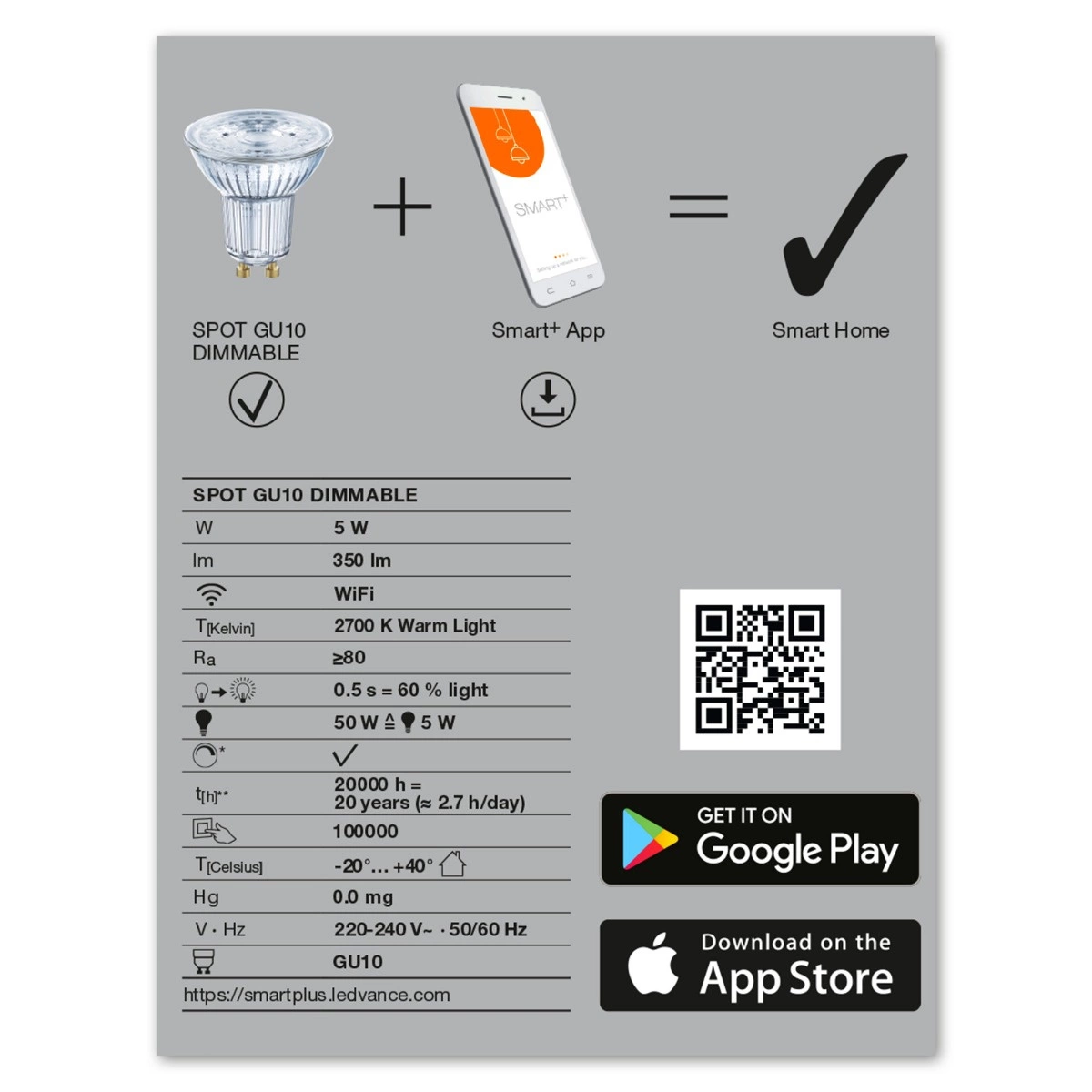Objevte novou kvalitu osvětlení s LED žárovkou GU10 Reflector 4,9 W = 50 W 350 lm stmívatelnou SMART+ WiFi od společnosti Ledvance. Tato žárovka nabízí jasný světelný tok 350 lm a teplotu barev odpovídající teplé bílé. Díky úhlu rozložení světla 45° je ideální pro osvětlení domácích i komerčních prostor a nabízí efektivní a energeticky úsporný výkon.