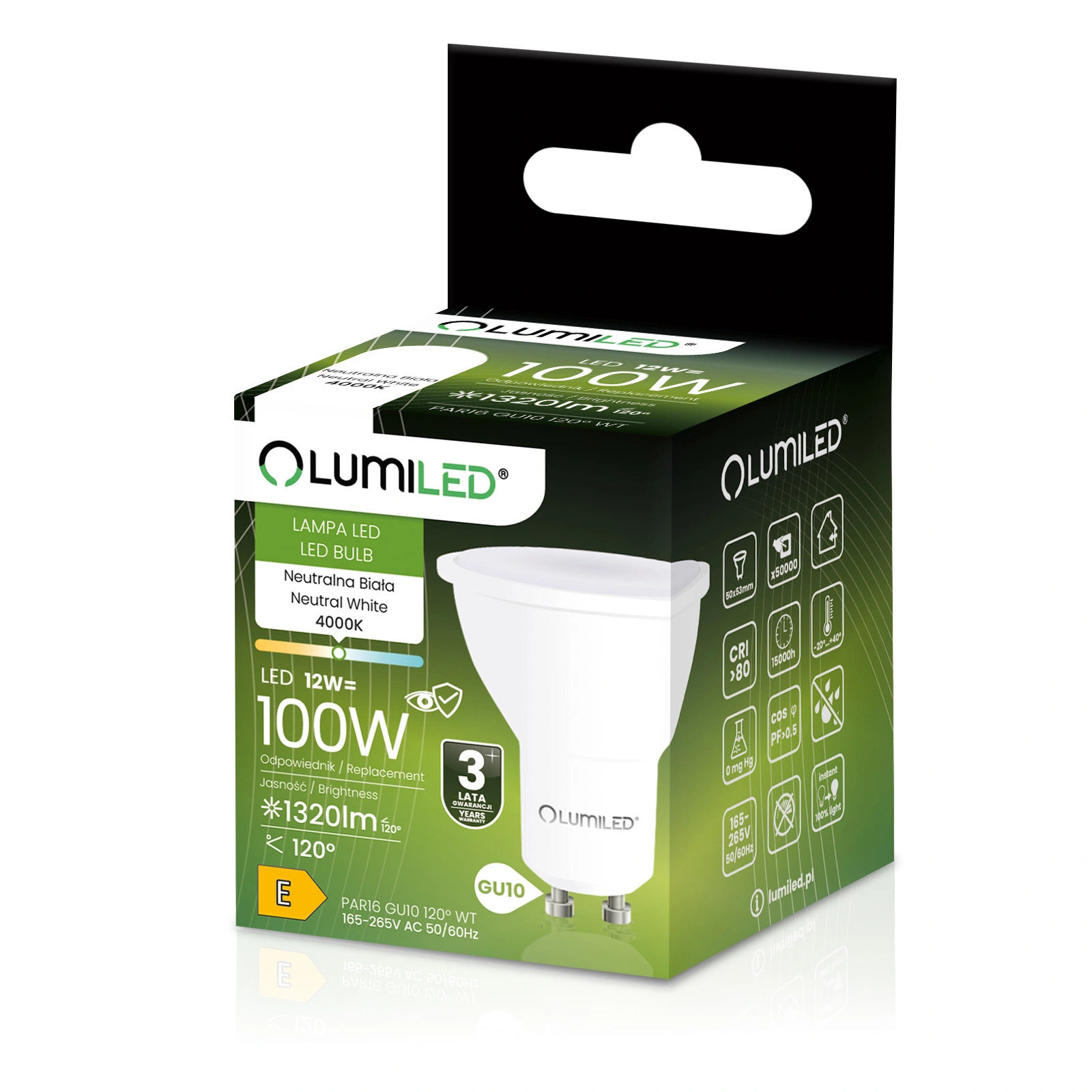 12W LED žárovka Lumiled GU10 je ideální volbou pro ty, kteří potřebují výkonné a jasné osvětlení s vysokou energetickou účinností. Vyzařuje neutrální barvu 4000 K a poskytuje přirozené, jasné světlo ideální pro kuchyně, obývací pokoje, kanceláře nebo pracovní prostory. Díky patici GU10 je reflektor kompatibilní s většinou bodových, stropních a směrových svítidel. Světelný tok 1320 lm odpovídá tradiční 100W žárovce a nabízí silné a jasné světlo bez blikání. Díky širokému úhlu vyzařování 120° reflektor rovnoměrně a efektivně osvětluje velkou plochu, čímž zlepšuje vizuální komfort. Je skvělou volbou do interiérů, kde je důležitá funkčnost a spolehlivost osvětlení.