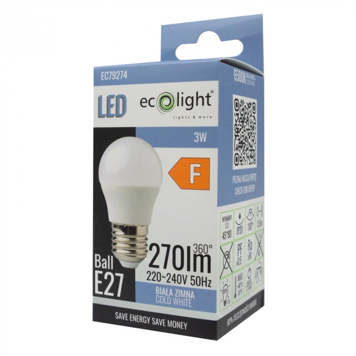 Objevte mimořádnou kvalitu světla s LED žárovkou P45 E27 od společnosti Ecolight! Tato moderní 3W LED žárovka vám poskytne jas 270 lumenů a zaručí optimální osvětlení každé místnosti. Díky moderní technologii poskytuje žárovka světelnou účinnost 90 lm/W, což znamená, že je energeticky úsporná, a díky barevné teplotě 6500 K nabízí chladné a ostré světlo podobné dennímu světlu. Je ideální do kanceláří, dílen nebo jako všeobecné osvětlení a poskytuje dobré podání barev s indexem podání barev Ra 80.
