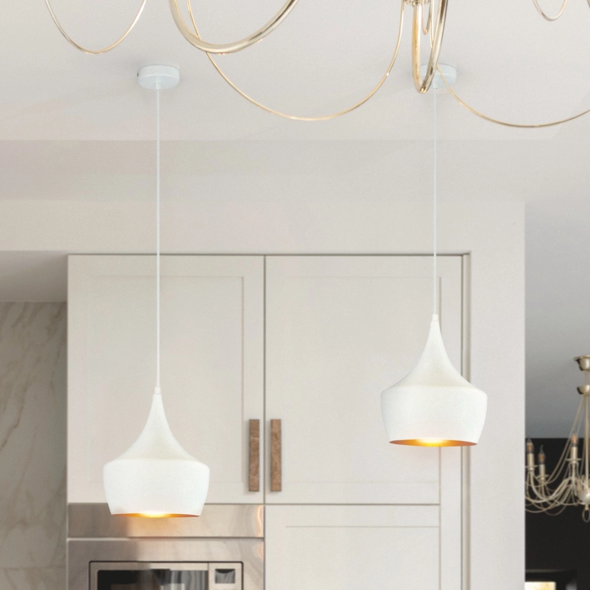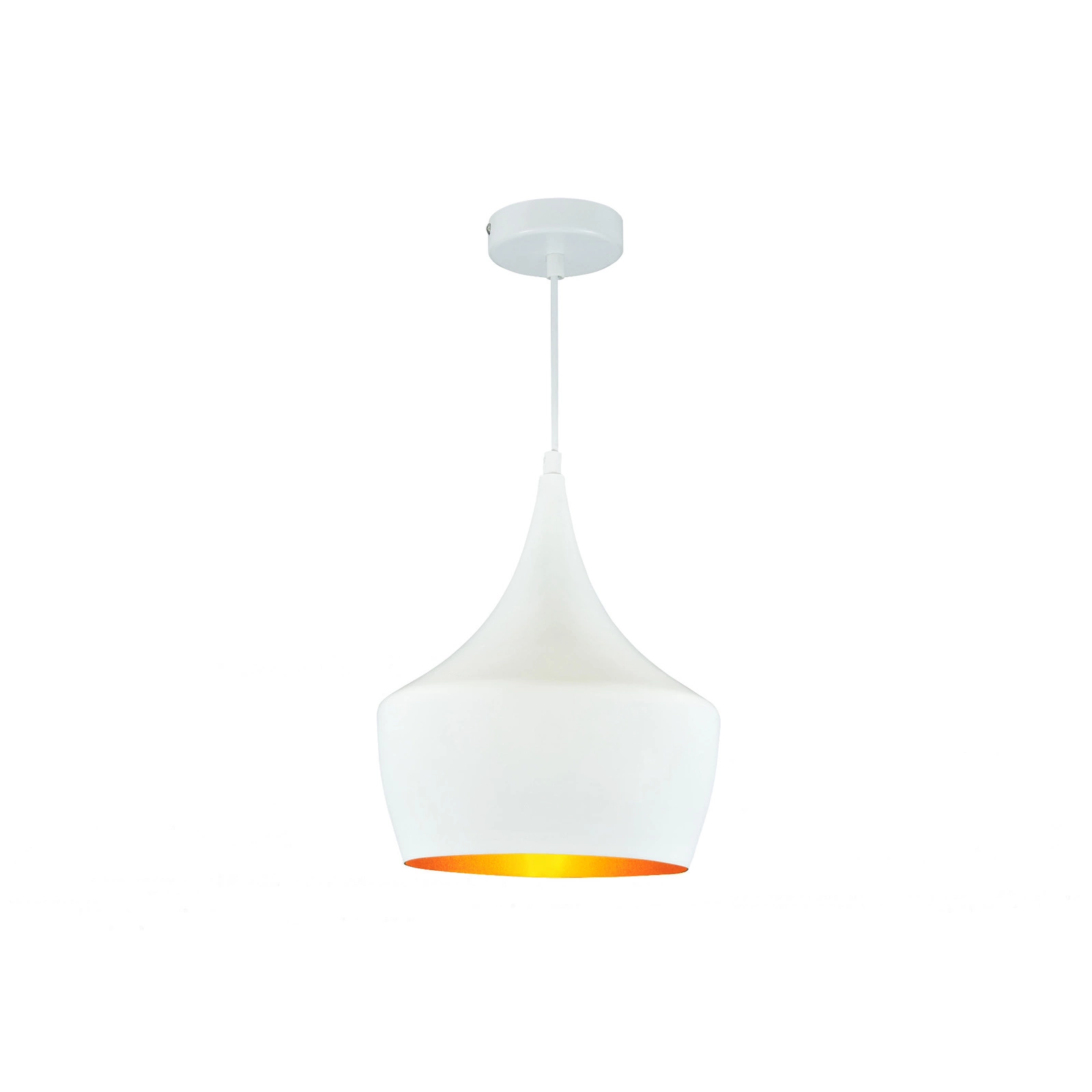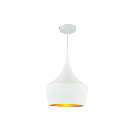 ZÁVĚSNÁ LAMPA značky GOLDLUX (Polux) z kolekce IL MIO MODERN v bílé a zlaté barvě se skvěle hodí do modernistických a loftových interiérů. Jeho elegantní a nadčasový design z něj dělá zajímavý doplněk výzdoby obývacího pokoje, jídelny, kuchyňského ostrůvku a dokonce i ložnice. Bude fungovat jako hlavní zdroj světla. Díky tomu, že je její vnitřek zlatavý, působí nejen velmi dekorativně, ale také hřeje a zpříjemňuje světlo vycházející z lampy. Měkké světlo dodá bytu útulný, atmosférický a intimní charakter. Díky možnosti nastavení délky kabelu si jej dokonale přizpůsobíte svému dekoru a potřebám. Do lampy se vejde jakákoliv žárovka s paticí E27, kterou lze také objednat v našem internetovém obchodě.