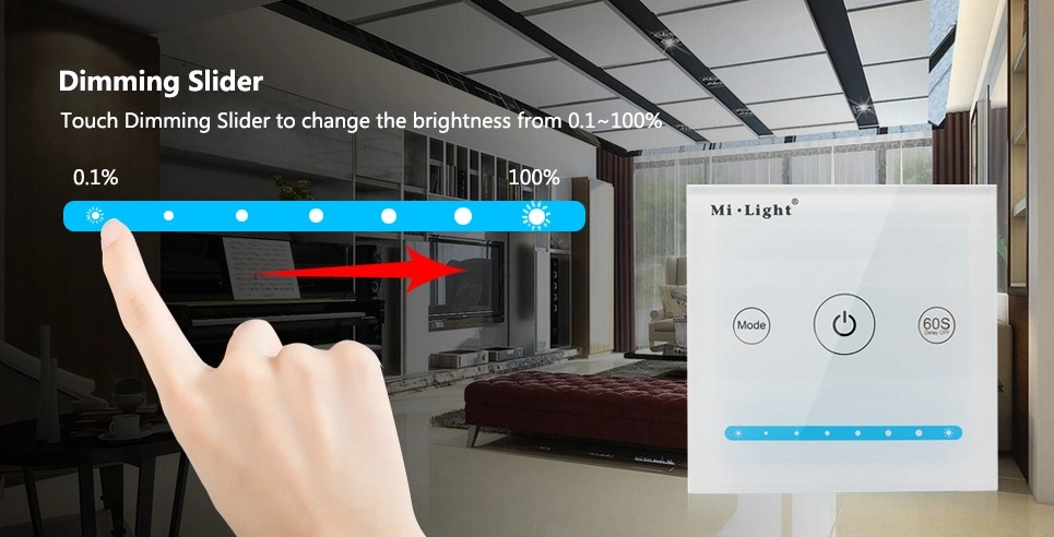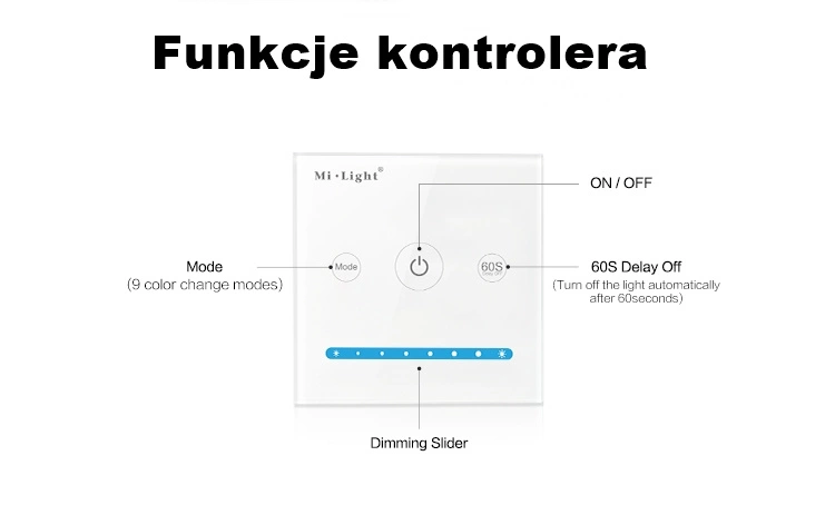Série nástěnných LED panelů pro zapuštěnou montáž Mi-Light se liší svou strukturou v závislosti na prezentovaném modelu. Mezi nimi je však mnoho souvislých prvků, jako jsou: dotyková ovládací pole, kterým jsou přiřazeny různé funkce. Tlačítko odpovědné za zapnutí/vypnutí LED osvětlení je umístěno v samém středu panelu, aby byl přístup k němu snadný a intuitivní. Pro změnu jasu a teploty barev (v případě CCT ovladačů) slouží dotykový posuvník, také u vícebarevného ovladače RGB, RGB+W nebo RGB+CCT zůstává princip fungování barevných změn nezměněn. Ovladač se ovládá pomocí číselníku s dotykovými posuvníky uspořádanými v jednotlivých barvách. Zbývající tlačítka slouží specifickým funkcím odpovídajícím danému modelu.