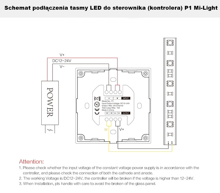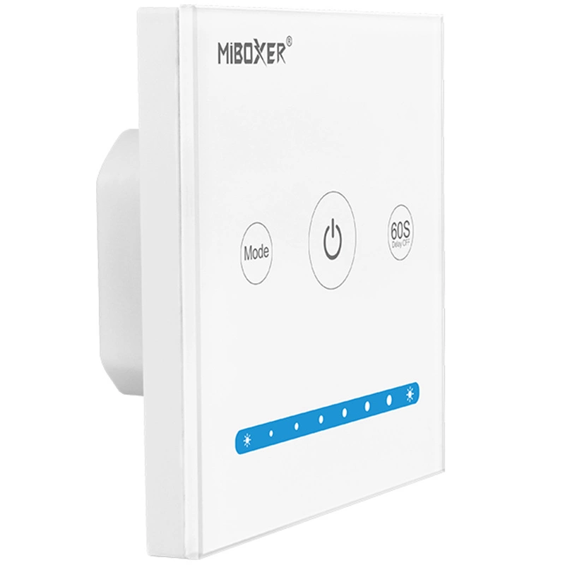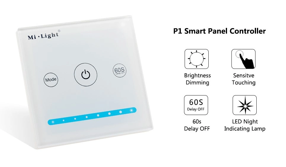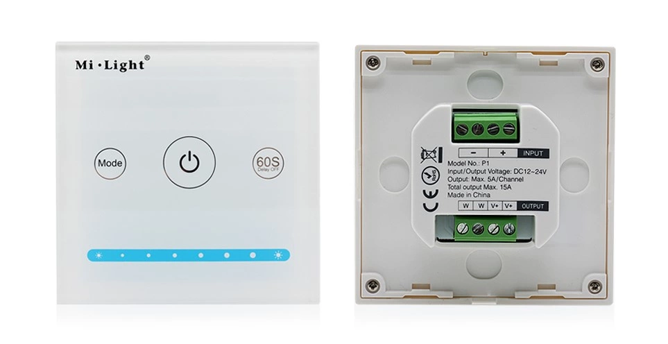 LED nástěnný panel modelu P1 je drátový 12V/24V DC 10A MONO dotykový stmívač od Mi - Light , který vám umožňuje řídit jas světla připojeného LED osvětlení. Díky tomuto stmívači získáte individuální přístup do jedné zóny instalace osvětlení, kterou můžete ovládat pomocí skleněného dotyku zabudovaného do nástěnného panelu. Zařízení je určeno pro podomítkovou (skrytou) instalaci na krabici 60 mm.
