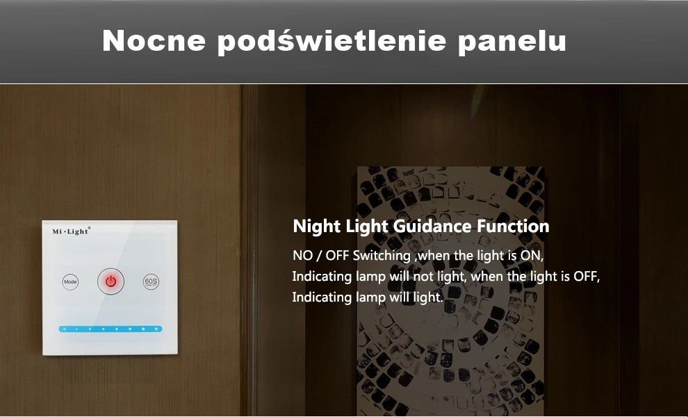Dotykový stmívač 12V/24V z řady Mi-Light je navíc vybaven funkcí nočního osvětlení dotykového pole, které má na starosti zapnutí zařízení. Po vypnutí stmívače se rozsvítí červená dioda, obvykle umístěná uprostřed (v závislosti na modelu), což umožňuje snadný přístup k panelu, protože zařízení snadno najdete. Tato funkce je užitečná zejména v případě, že interiér není příliš dobře osvětlen nebo je úplná tma. Světlo vyzařované diodou je neutrální a nedráždí oči.