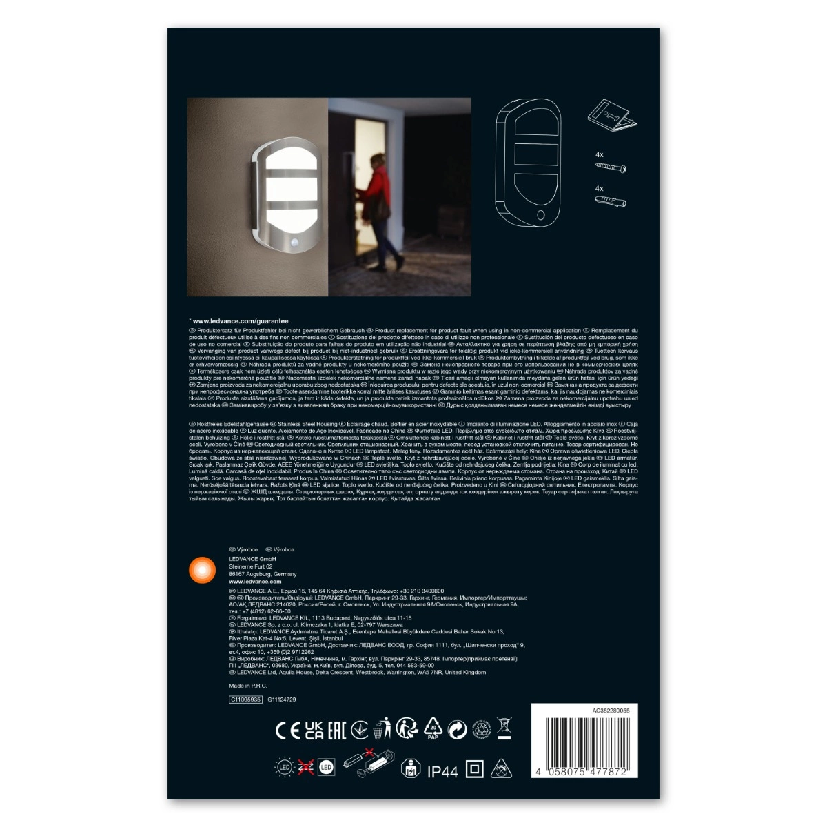 Fasádní nástěnné svítidlo PLATE WALL ze série Endura od známé a na trhu s osvětlením renomované společnosti LEDVANCE je vyrobeno z vysoce kvalitní stříbrné nerezové oceli .