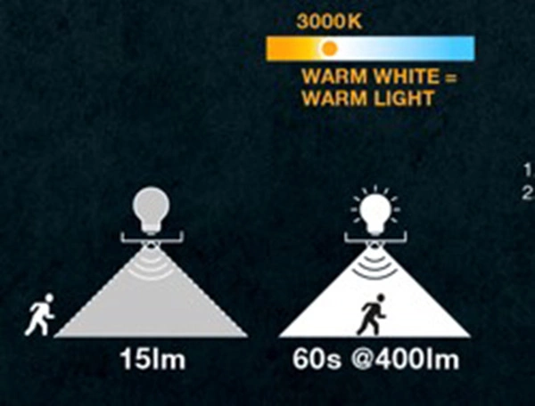Má pohybový senzor a světelný senzor. Senzorem řízená spínací doba je 60 sekund. Dosah detekce pohybového senzoru je 5 - 8 m. Prahová hodnota detekce světelného senzoru až 35lx.