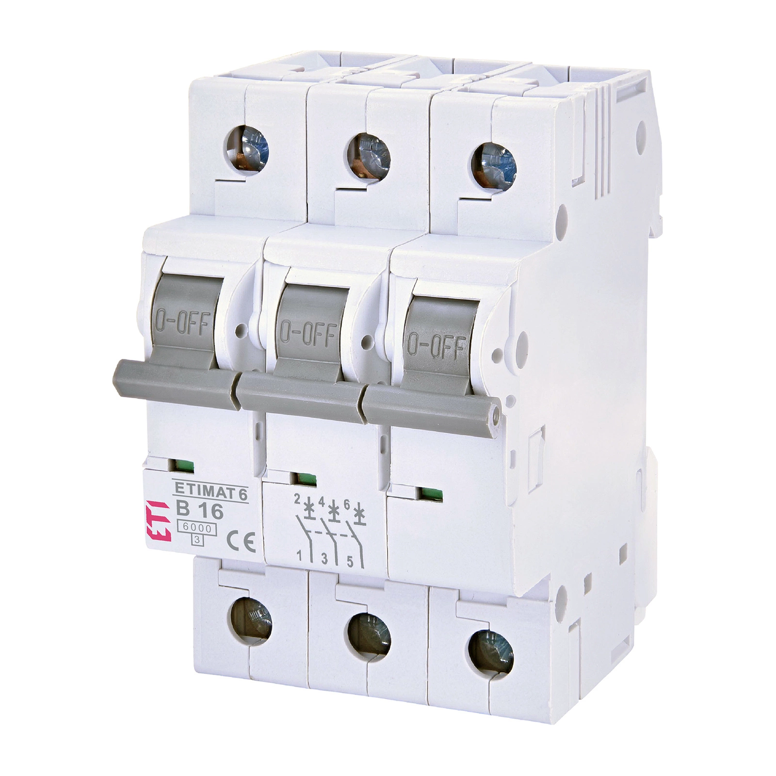 Omezovač výkonu 3-pólový 3P B16A 6kA AC. Jedná se o elektrické zařízení určené k vypnutí napájení v případě přetížení nebo příliš velké spotřeby energie v porovnání s připojeným napájením.