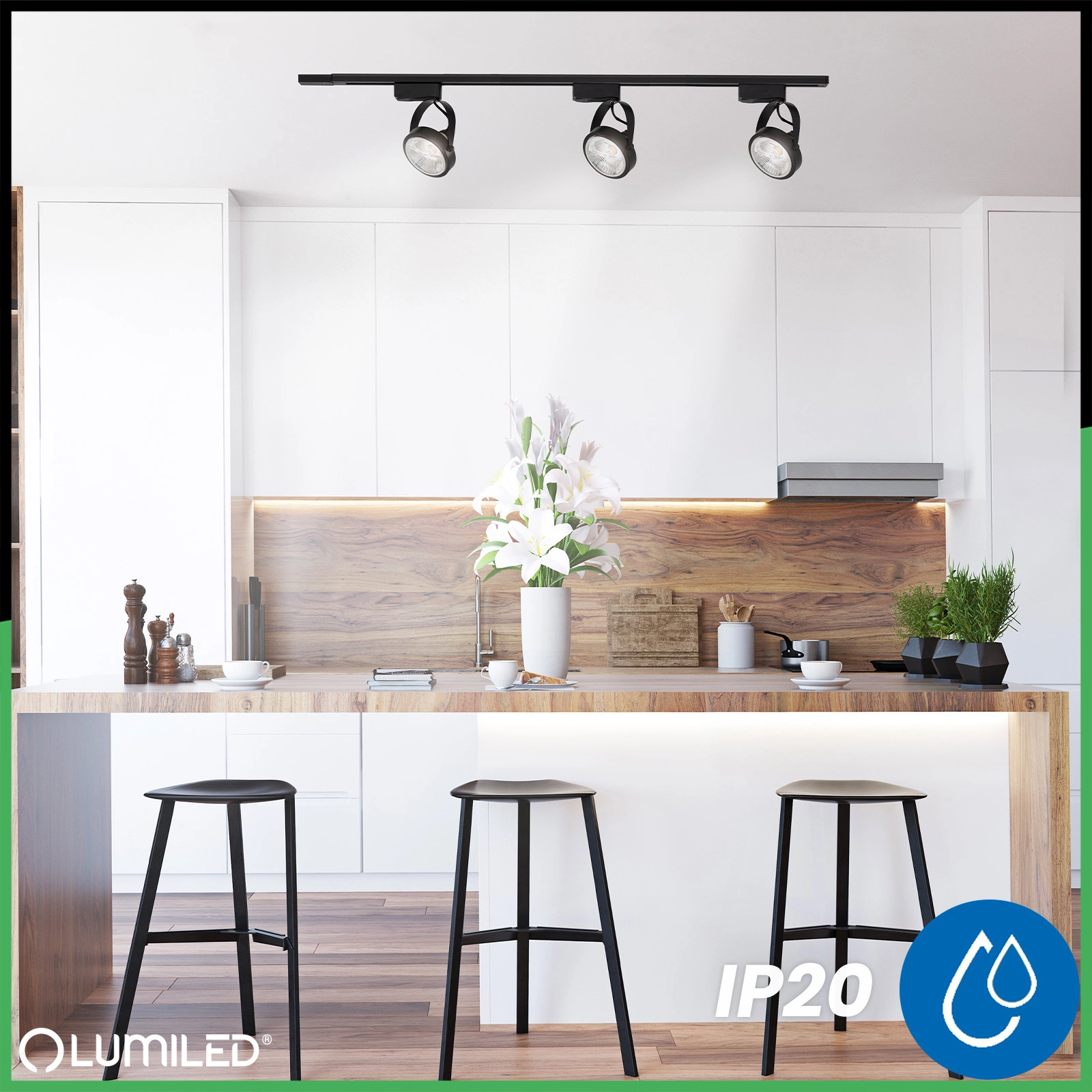 Sada: Osvětlovací lišta 1,5m + Tři reflektory na kolejích v černé barvě, vyrobené z vysoce kvalitního hliníkové slitiny známé a renomované značky osvětlení Lumiled®, je kombinací minimalismu a funkčnosti, která se hodí do každé místnosti.