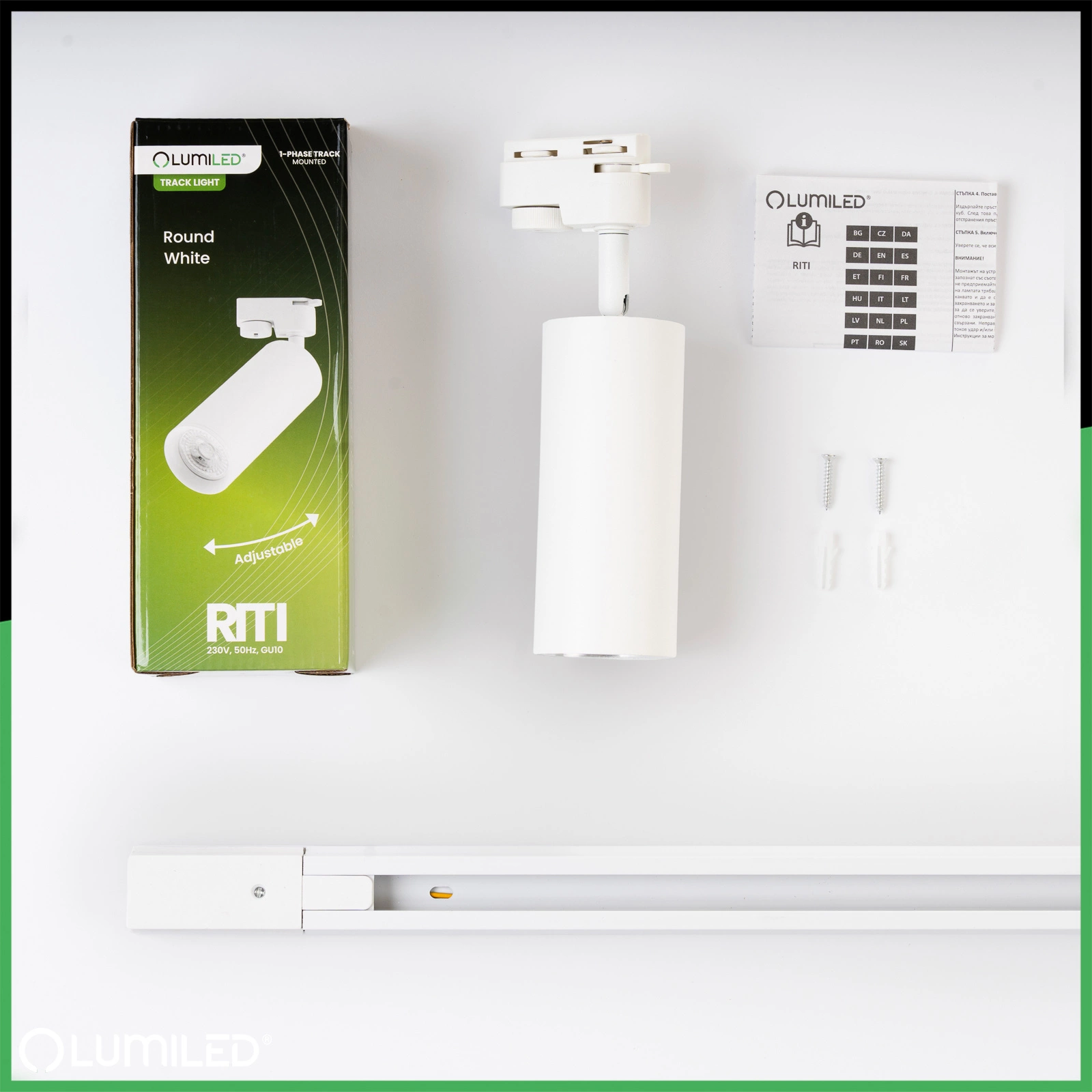 Sada osvětlovacích kolejnic 1,5 m kolejnice + 3x kolejnicové světlo RITI GU10 Bílá LUMILED