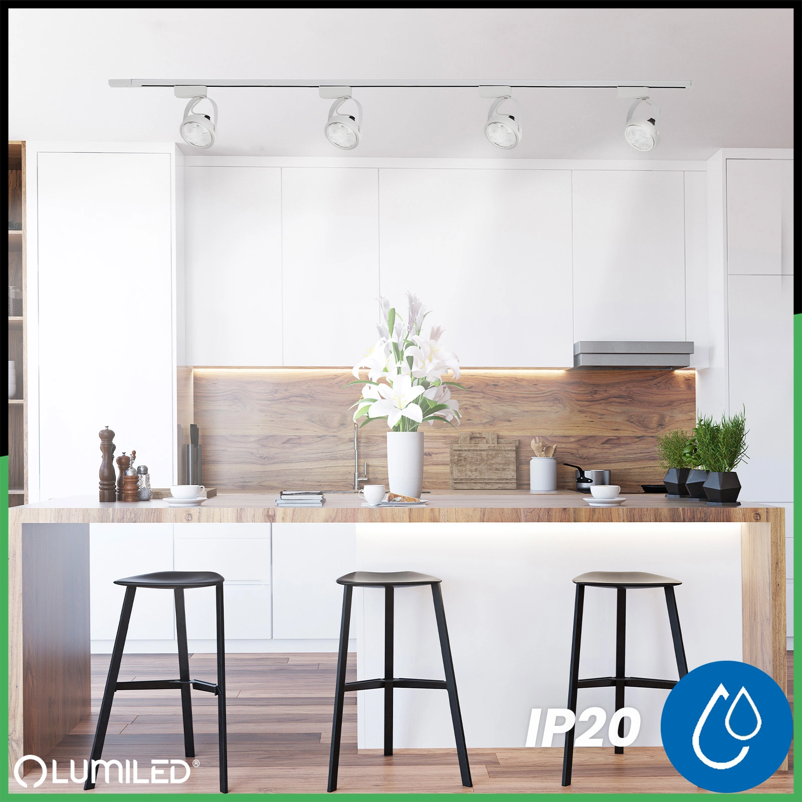 Sada: Osvětlovací lišta 2m + Čtyři světelné stopy v bílé barvě, vyrobené z vysoce kvalitního hliníkové slitiny známé a renomované značky osvětlení Lumiled®, je kombinací minimalismu a funkčnosti, která se hodí do každé místnosti.