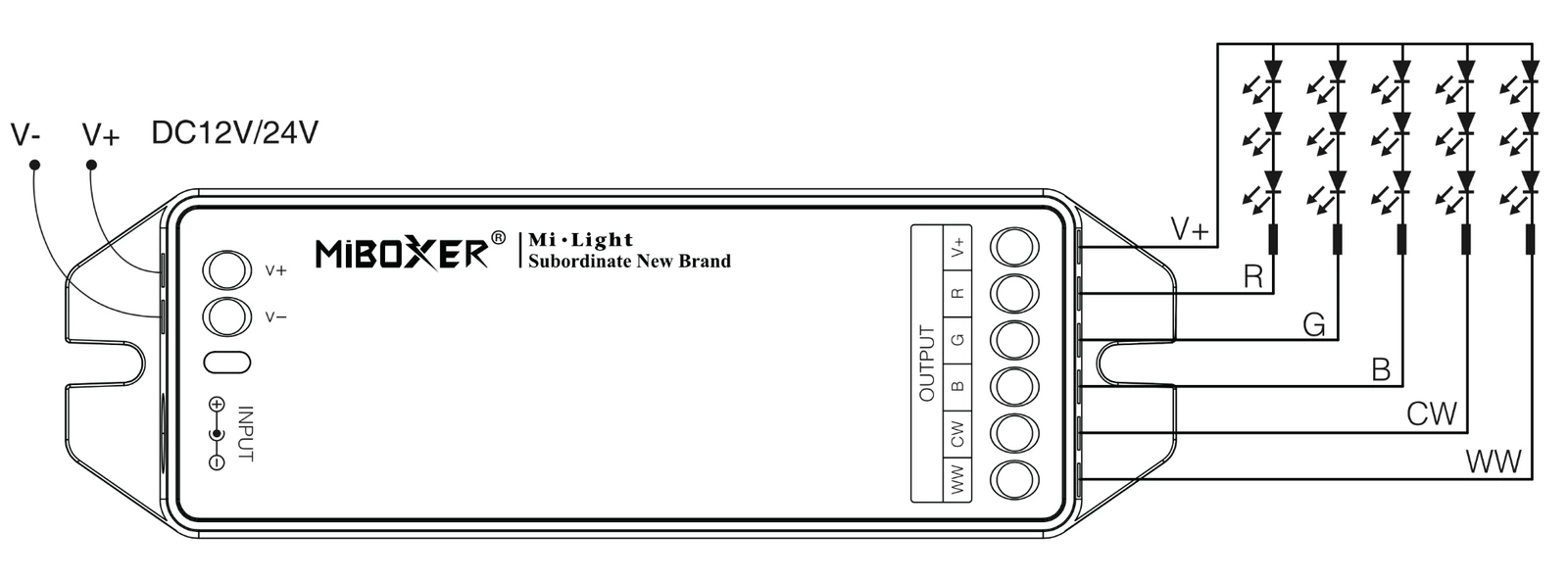- Počet výstupů přijímače: 5 výstupů (R/G/B/CW/WW) - společná anoda