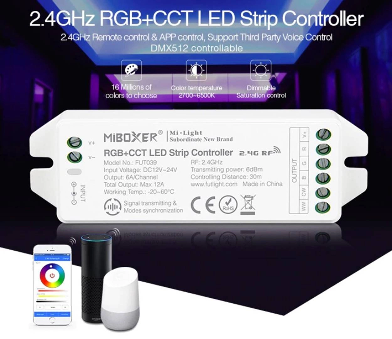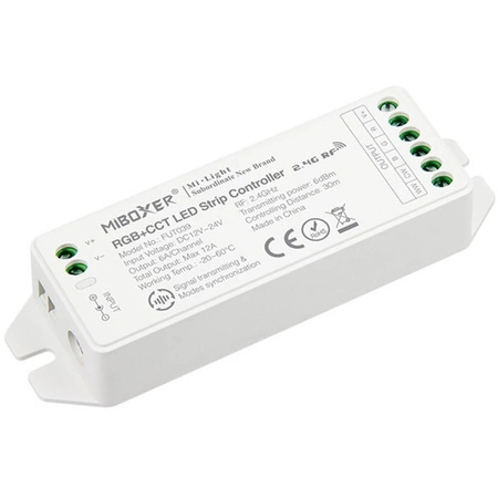 Radiový LED přijímač Mi-Light RGB +CCT 12V / 24V DC 12A je kompaktní zařízení, které slouží k ovládání vícebarevného LED osvětlení i všech dostupných bílých barev. Regulátor FUT039M je novější verze regulátoru FUT039 , která byla rozšířena o přenos signálu a synchronizaci. To nám umožňuje získat nekonečný signál, ale musíme mít na paměti, že vzdálenost mezi ovladači by neměla být větší než 30 m. Konstrukce přijímače umožňuje měnit barevnou paletu připojeného RGB+CCT LED pásku (vícebarevné + všechny bílé barvy od teplé přes neutrální až po studenou) díky použití vhodného stmívače. Zařízení komunikuje s vysílajícím zařízením prostřednictvím rádia. Přijímač je kompatibilní se zařízeními řady Mi-Light .
