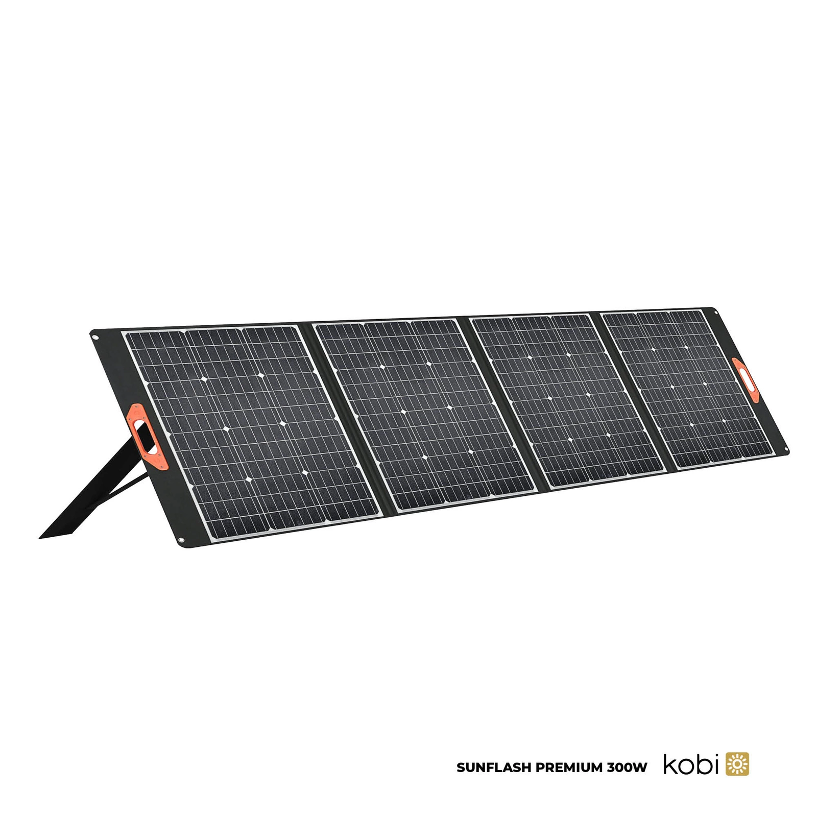 Solární panel Sunflash 300W je produktem renomované společnosti KOBI. Velmi praktické použití v kempu, na rodinné dovolené nebo doma, všude tam, kde lze využít solární energii. Solární baterie je vybavena výstupním portem, umístěný v krabici uvnitř posuvného krytu: výstupní port MC4 DC, který slouží k připojení úložiště energie (PowerBox). Pro bezpečnost používání je panel vybaven vestavěným ochranný systém, které mohou zabránit zkratům, přetížení, přehřátí a dalšímu poškození výrobek atd. Zařízení je vybaveno nejnovějšími technologiemi regulace napětí, podpůrné výstupní napětí 18 V nebo 36 V, kterou lze nastavit pomocí přepínače napětí. Zajistit co nejvyšší účinnost výroby energie optimální teplota by se měla pohybovat mezi 20 °C až 30 °C a nastavení směr panely směrem k vysoké sluneční záření. Panel je vybaven vestavěným stojanem, což vám umožní zvolit správný úhel pro nejlepší vystavení slunci. Pro získání většího množství energie lze panely zapojit paralelně nebo sériově při zachování odpovídajícího napětí. Panel dokonale zapadá do do zavazadlového prostoru automobilu jeho rozměry ve složeném stavu jsou 720x630x50 mm, a po rozložení 2355x720x25 mm, pouze nízká hmotnost 6.35 kg usnadňuje manipulaci a rozkládání.