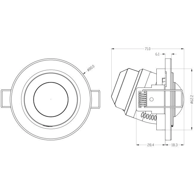 Senzor pohybu PIR je vyroben z plastu a jedná se o moderní detektor pro zapuštěnou montáž, který k detekci pohybu využívá infračervené záření. Jednotka je vybavena praktickými držáky pro snadnou a bezpečnou instalaci do podhledů. Snímač se vyznačuje snadným přístupem k nastavení, které určuje dobu zapnutí přijímače a citlivost na intenzitu světla, takže není nutné zařízení rozebírat kvůli změně nastavení.