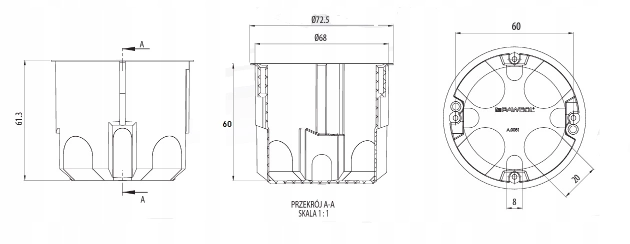 PAWBOL A.0081K instalační krabice pod omítku PK60 , hluboká se šrouby - určena pro zapuštěnou montáž. Je vyrobena z vysoce kvalitního plastu a má krytí IP30.