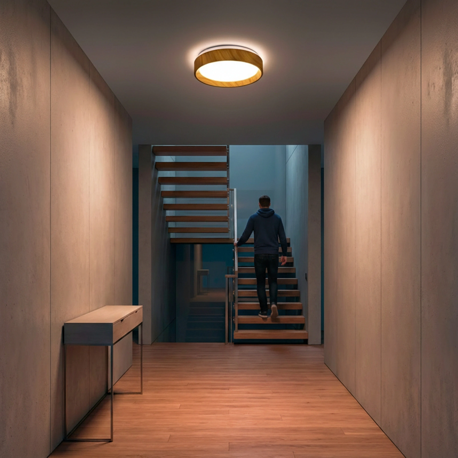 Povrchová montáž umožňuje rychlou instalaci plafonu bez zásahu do stropu a bez dalších dokončovacích prací. Barevné provedení inspirované dřevem opticky zatepluje interiér a kruhový tvar pomáhá ihned po instalaci vytvořit jednotný a úhledný efekt. Díky tomu svítidlo dobře zapadá do uspořádání a esteticky uzavírá vzhled stropu.
