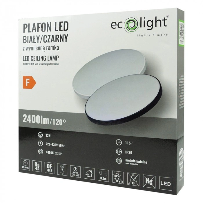 Plafond LED stropní světlo 32W 2400lm 4000K neutrální bílá s výměnným černým nebo bílým rámečkem Ecolight