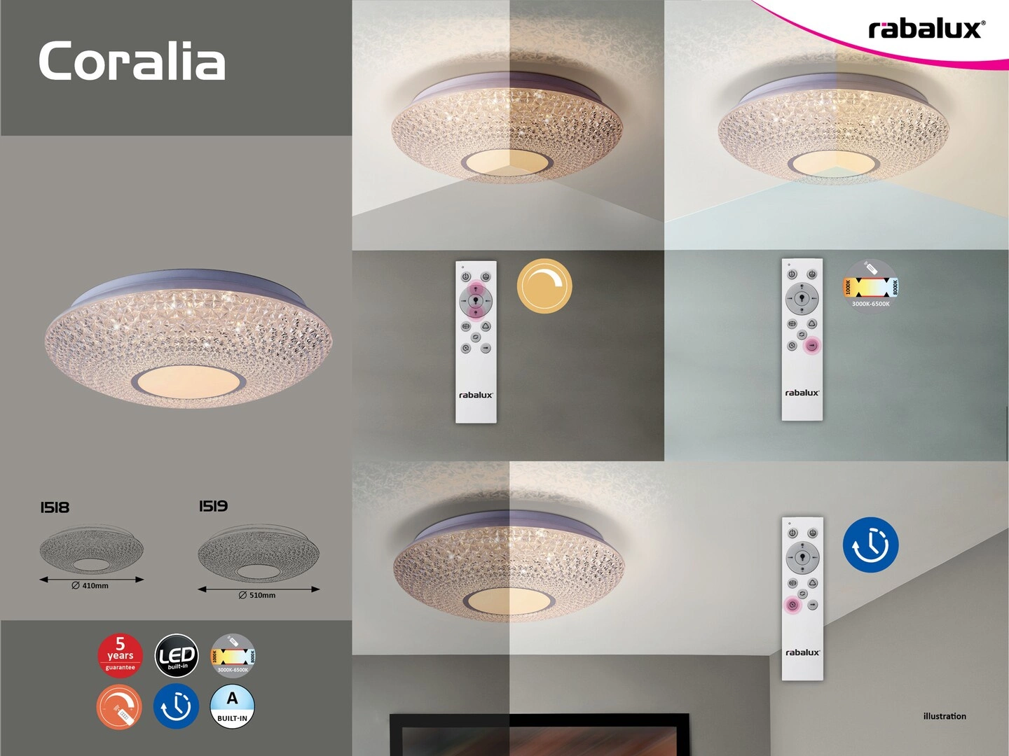 Objevte moderní design a pokročilý výkon stropního svítidla Coralia LED od společnosti Rabalux. Toto jedinečné svítidlo v sobě spojuje eleganci s funkčností a nabízí nejen estetický vzhled, ale také výraznou úsporu energie. Díky nastavitelné teplotě barev od 3000 do 6500 K přizpůsobíte osvětlení své náladě a potřebám interiéru a zajistíte příjemnou atmosféru v každé místnosti. Žárovka o příkonu 72 W poskytuje působivý výkon 5728 lumenů, což zajišťuje vynikající osvětlení prostoru. Vysoce kvalitní materiály a zpracování jsou zárukou dlouhé životnosti a spolehlivosti po mnoho let.