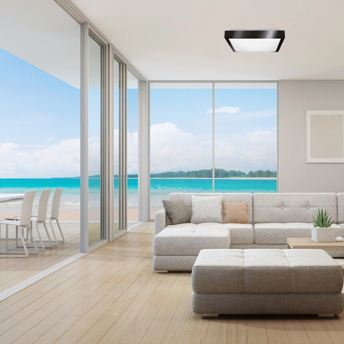Čtvercové stropní LED svítidlo v černé barvě o šířce 30 cm spolu s LED žárovkami Lumiled bude odolným a moderním zdrojem světla ve vaší domácnosti. Stropní svítidlo bylo vytvořeno pro zákazníky, kteří hledají stylové osvětlení do svého interiéru v moderní verzi. Stropní svítidlo může být díky svému výraznému vzhledu a velikosti hlavním osvětlením místa, kde se nachází. Je vyrobena z vybraných vysoce kvalitních materiálů: hliníku a akrylu. Opálové stínidlo snižuje efekt oslnění a zajišťuje rovnoměrný rozptyl světla.