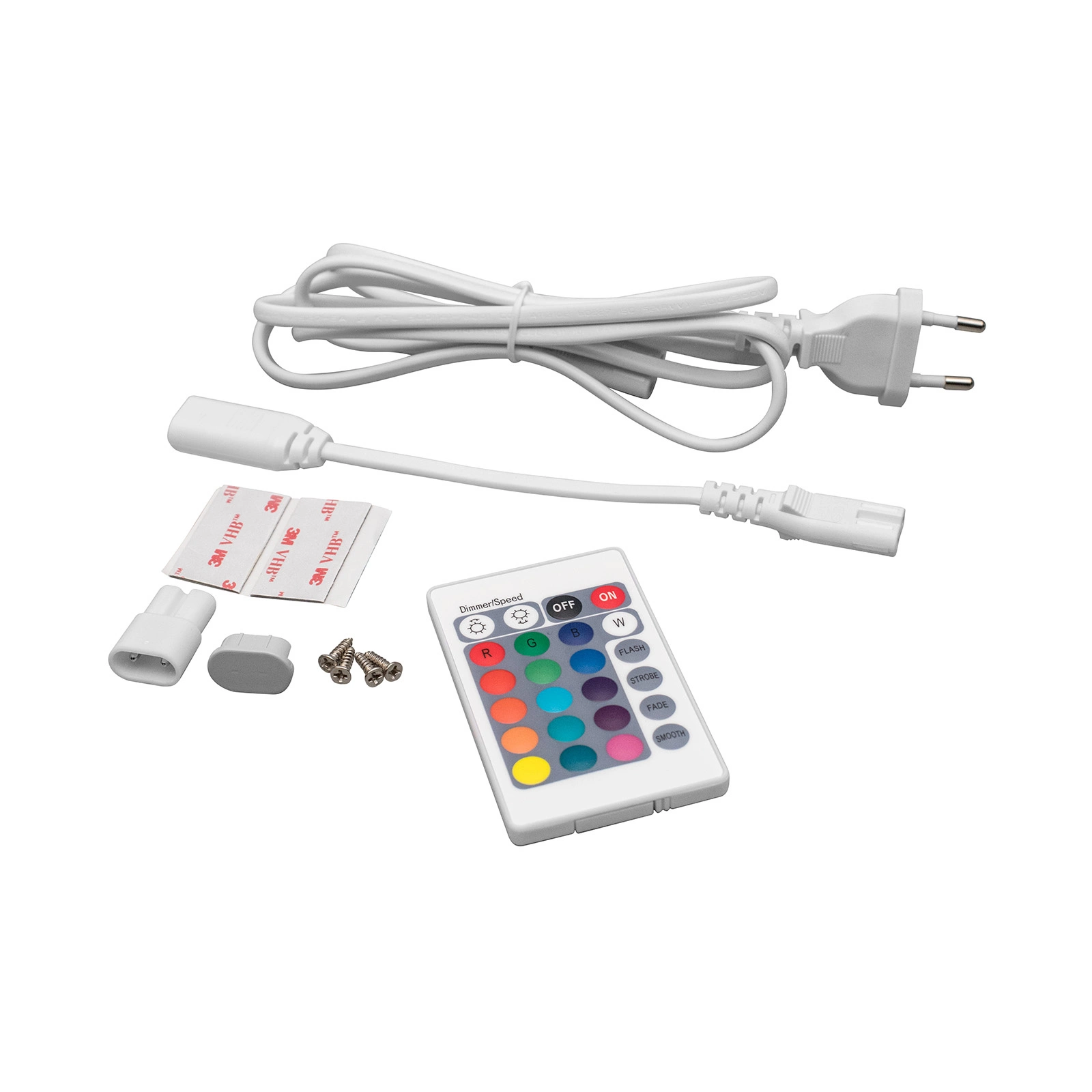Vysokonapěťová podskříňová svítidla s technologií RGBW. Vlastnosti produktu: Světelný tok: až 350 lm. Zapínání a vypínání, změna barvy světla a stmívání pomocí dálkového ovladače. Materiál: hliník. Stříbrná barva. K dispozici 2 délky: 30 a 50 cm. Možnost připojení až 10 svítidel (verze 30 cm) nebo až 5 svítidel (verze 50 cm). Výhody produktu: Přímé připojení ke střídavému napájení díky vestavěnému napájecímu zdroji. Úzký a hladký model. Rovnoměrné rozložení světelného toku. Snadná a rychlá instalace na téměř jakýkoli povrch (lepicí páska nebo šrouby). Oblast použití: Osvětlení polic a osvětlení pod skříně. Vybavení / Příslušenství: Včetně externích kabelů (1,5 m). Včetně pevných konektorů a flexibilních elektrických kabelů.