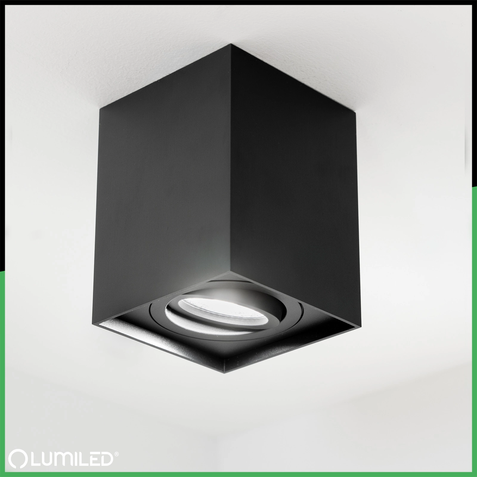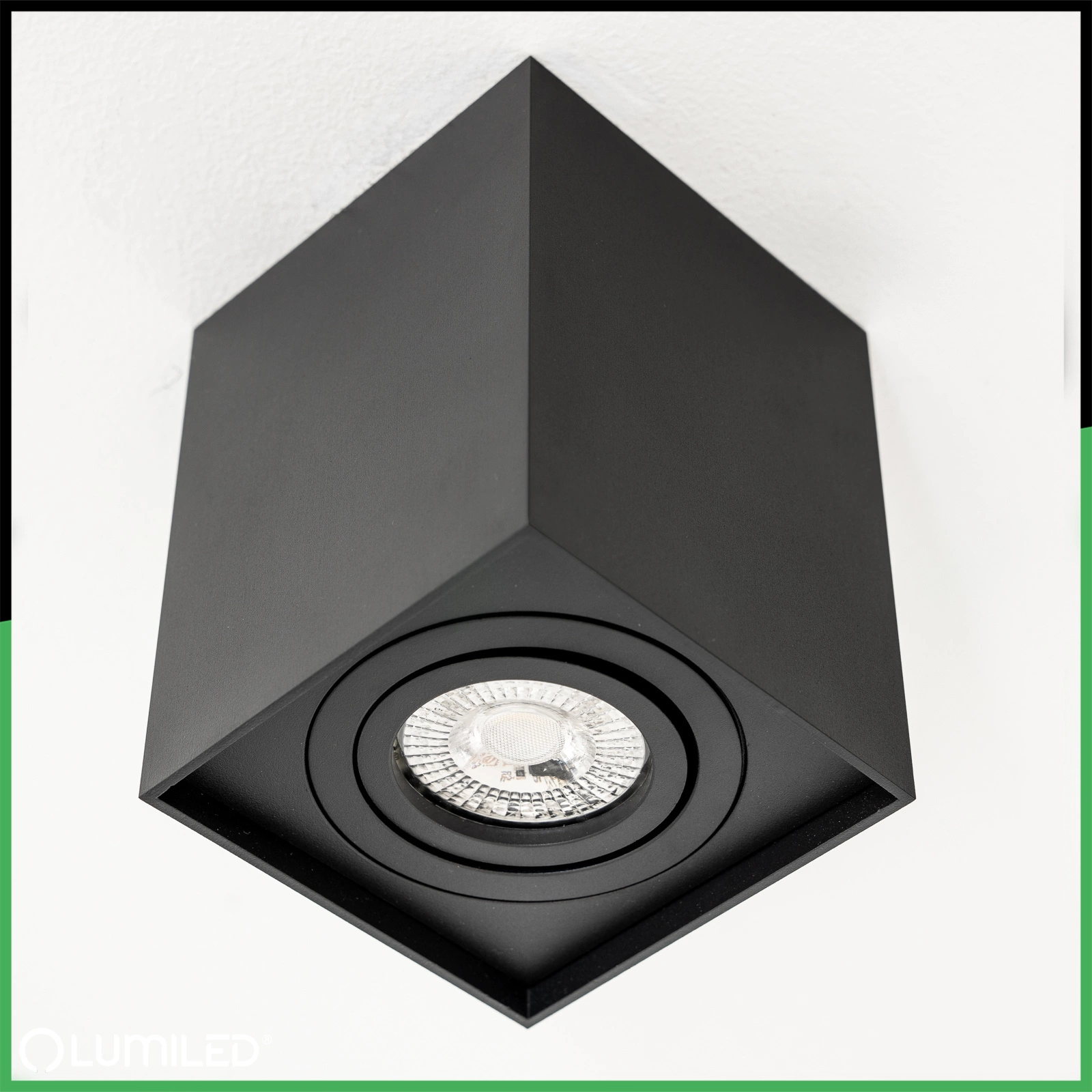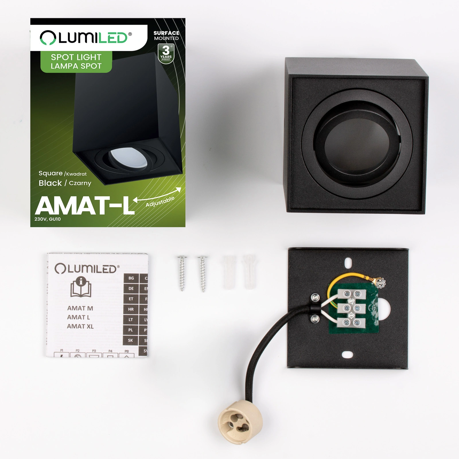 Čtvercové, pohyblivé, přisazené svítidlo v černé barvě, série AMAT L , výška 115 mm , od LUMILED. Jedná se o moderní světelný zdroj. Halogenové svítidlo namontované na centrálním místě bude ozdobou lahodící oku a bude také dokonalým doplňkem moderních nebo minimalistických interiérů, dodá jim kouzlo a změní jejich vzhled.