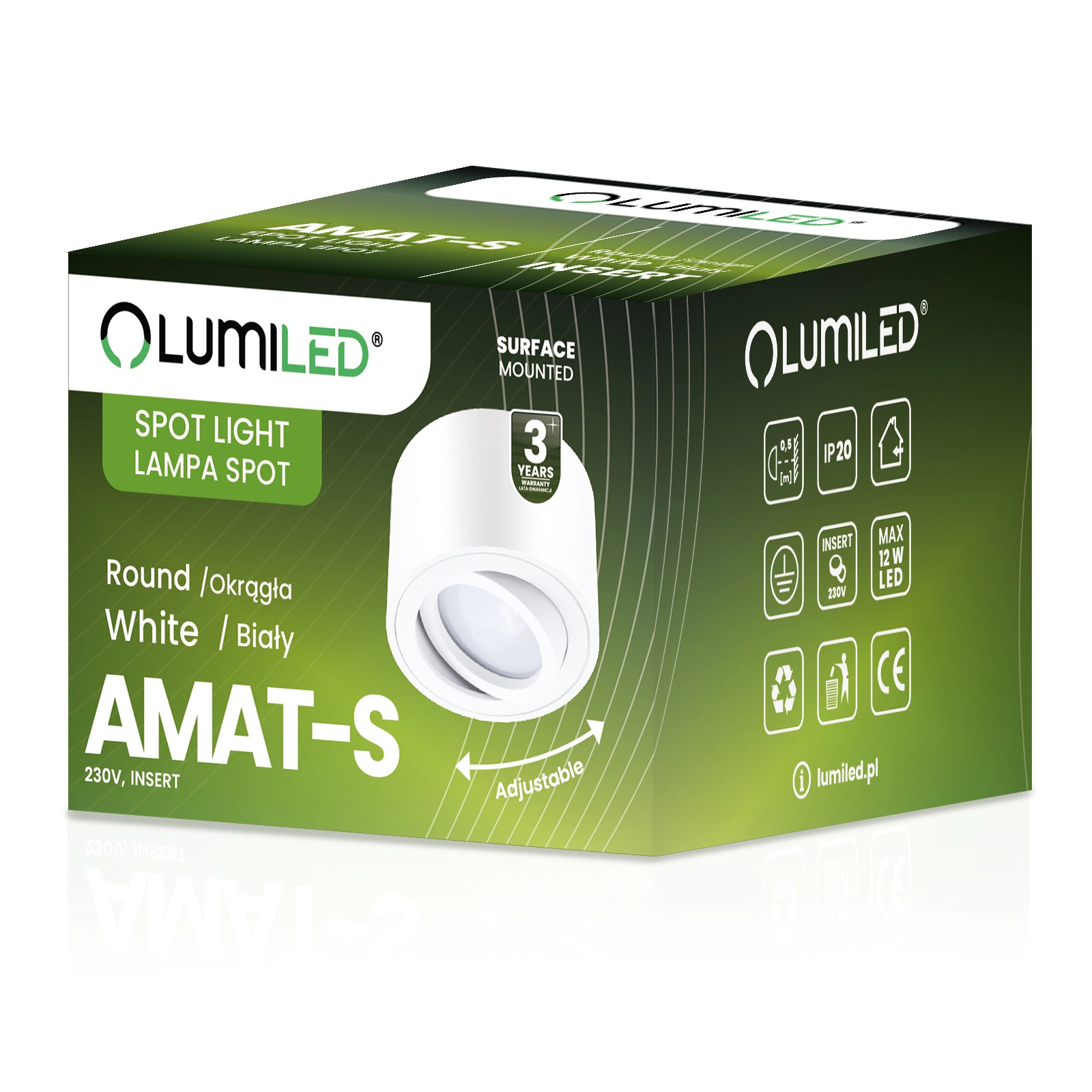 Kulaté, pohyblivé, přisazené svítidlo v bílé barvě, série AMAT S , výška 50 mm , od LUMILED. Jedná se o moderní světelný zdroj. Halogenové svítidlo namontované na centrálním místě bude ozdobou lahodící oku a bude také dokonalým doplňkem moderních nebo minimalistických interiérů, dodá jim kouzlo a změní jejich vzhled.