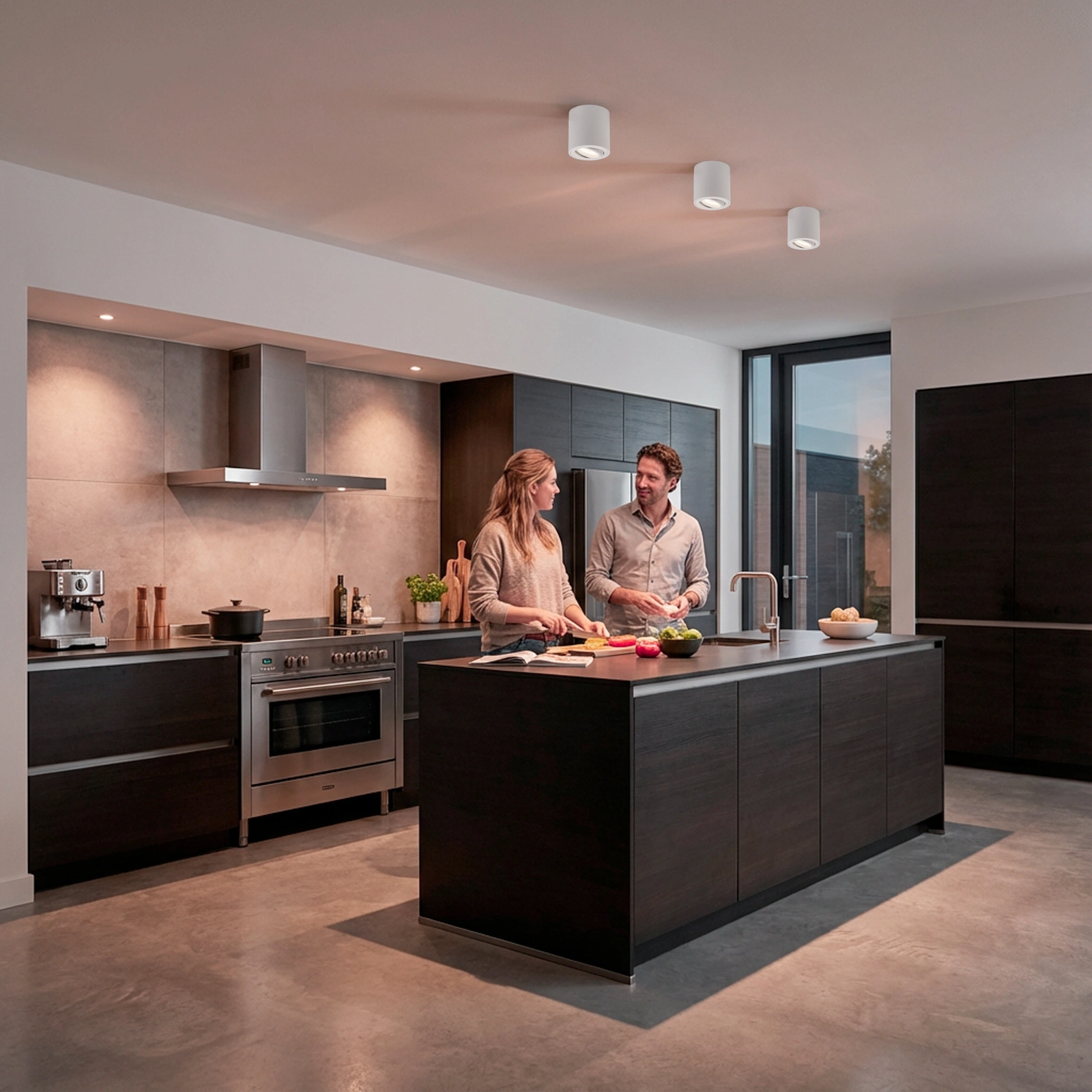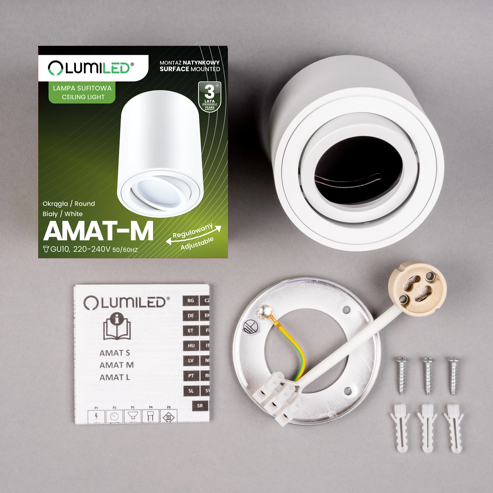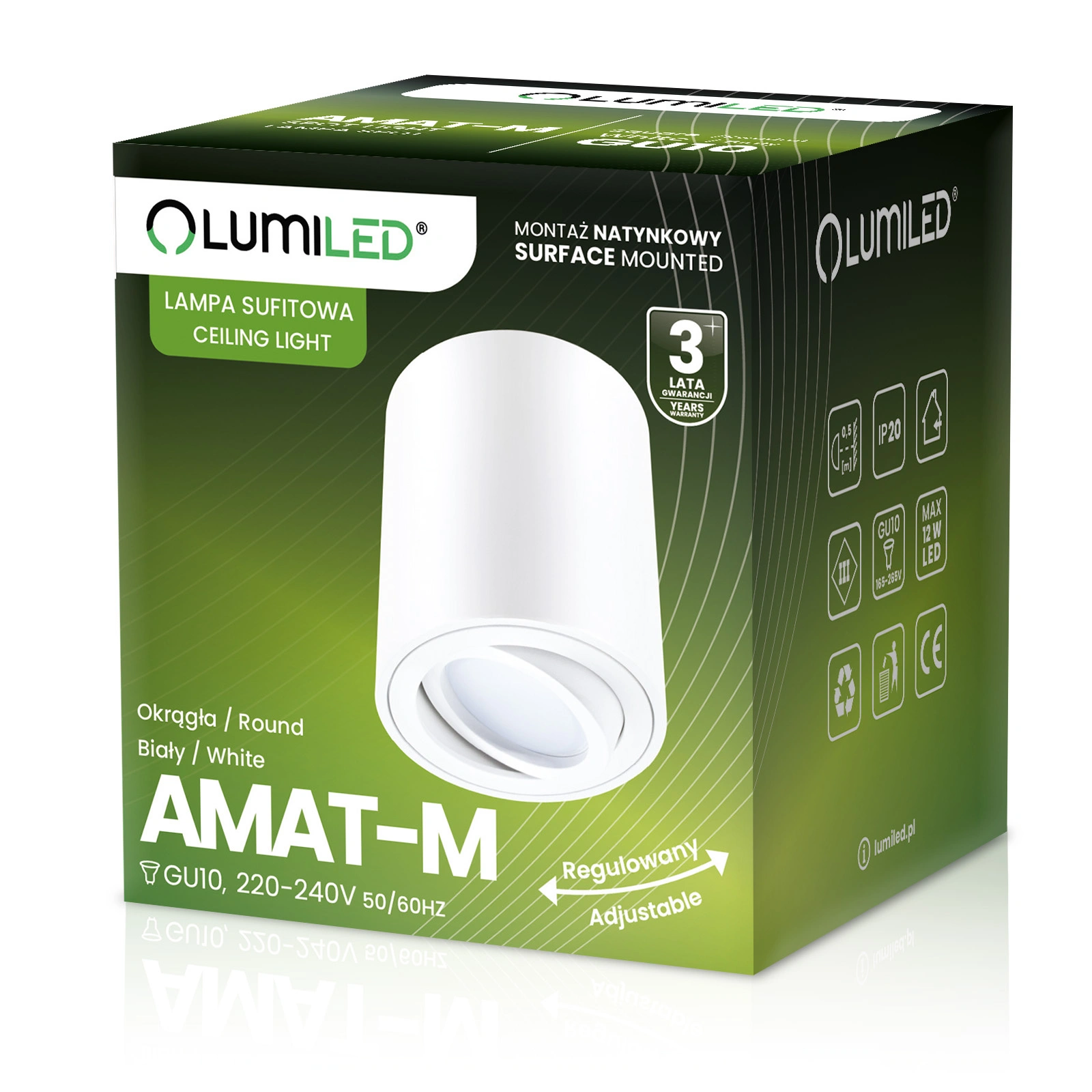 Kulaté, pohyblivé, přisazené svítidlo v bílé barvě, řada AMAT M , výška 84 mm , od LUMILED. Jedná se o moderní světelný zdroj. Halogenové svítidlo namontované na centrálním místě bude ozdobou lahodící oku a bude také dokonalým doplňkem moderních nebo minimalistických interiérů, dodá jim kouzlo a změní jejich vzhled.