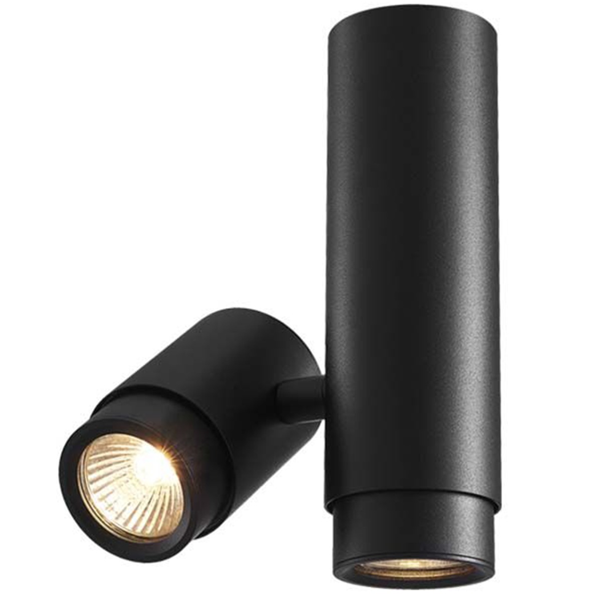 Dekorativní vnitřní svítidlo 2xGU10 v černé barvě ve formě tubusu. Tělo lampy je vyrobeno z lehkého a odolného hliníku , který nepodléhá korozi. Povrch tělesa lampy je pokryt matným lakem s pískovou texturou, odolným proti drobným škrábancům . Má otočnou hlavu , která umožňuje nasměrovat světlo na požadované místo. Toto svítidlo má vyměnitelný zdroj světla , což má své výhody, jako je nutnost výměny celého svítidla v případě poruchy žárovky.
