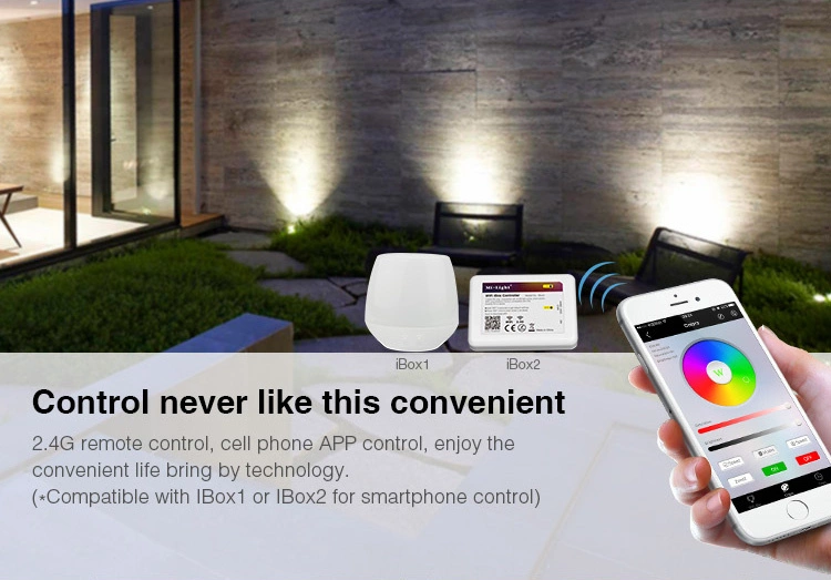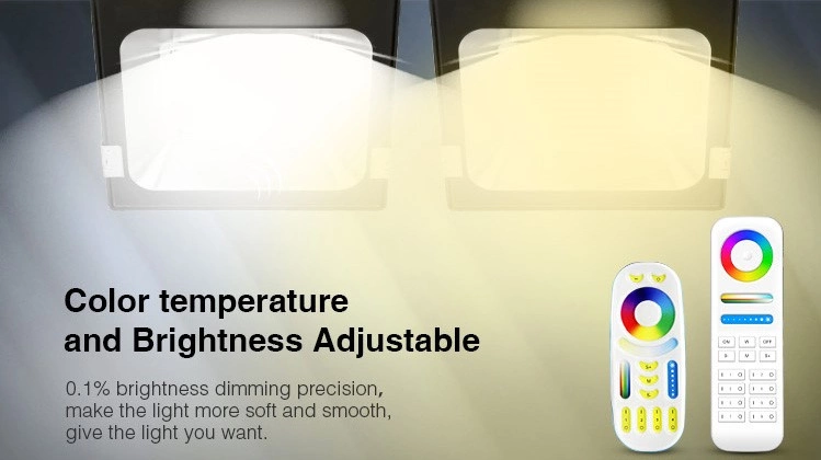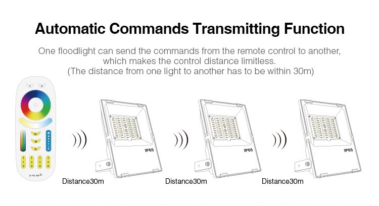 Moderní LED světlomet FUTT07 od Mi-Light je inteligentní LED světelný zdroj ve verzi RGB+CCT o výkonu 100W , který lze připojit přímo do sítě 86-265V AC . HALOGEN LED vyzařuje barevné RGB světlo a bílou barvu od 2700K do 6500K (teplé/studené) a světelný tok je od 7500lm do 8500lm . Materiály použité na výrobu venkovního svítidla zaručují vysokou úroveň voděodolnosti IP65 . Světlomet Floodlight pracuje ve 4- a 8zónovém standardu a navíc umožňuje plynulé nastavení jasu, barvy světla, sytosti a teploty barvy bílého světla. Světlomet lze ovládat pomocí dálkového ovladače nebo bezplatné mobilní aplikace, která vyžaduje použití iBOX Wi-Fi bridge . Příjemnou možností je funkce repeater , která nám při zachování 30m vzdálenosti od následných světlometů umožní získat neomezený dosah.