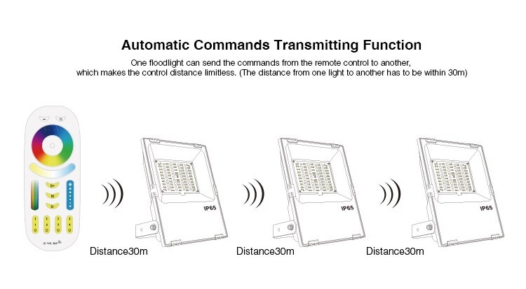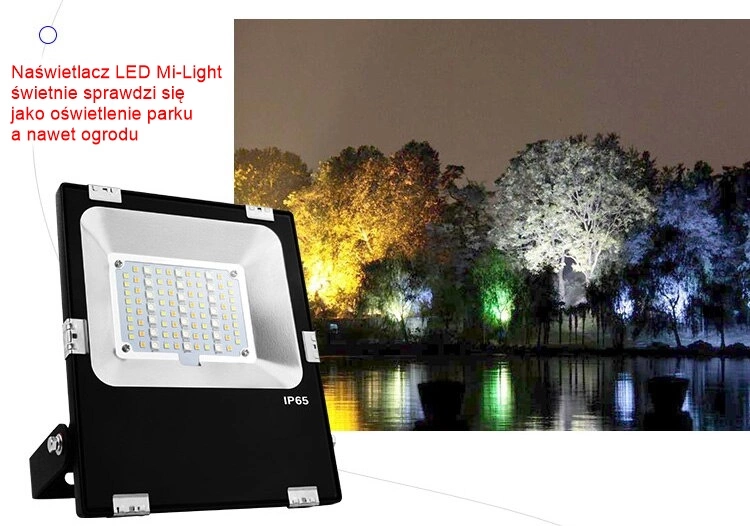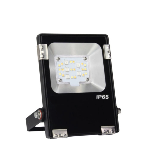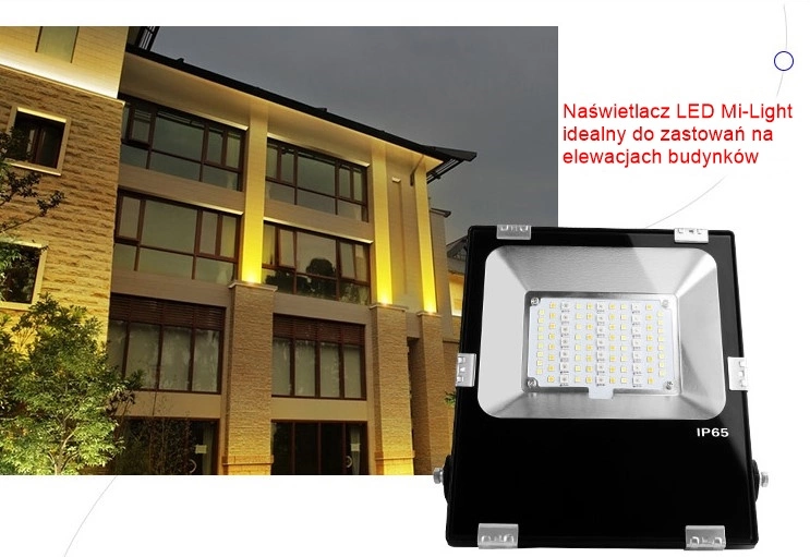 Moderní LED světlomet FUTT05 od Mi-Light je inteligentní LED světelný zdroj ve verzi RGB + CCT o výkonu 10W , který lze připojit přímo do sítě 86-265V AC . HALOGEN LED vyzařuje barevné RGB světlo a bílou barvu od 2700K do 6500K (teplé/studené) a světelný tok se pohybuje od 750lm do 900lm . Materiály použité na výrobu venkovního svítidla zaručují vysokou úroveň voděodolnosti IP65 . Světlomet Floodlight pracuje v 8zónovém standardu a navíc umožňuje plynulé nastavení jasu, barvy světla, sytosti a teploty barvy bílého světla. Světlomet lze ovládat pomocí dálkového ovladače nebo bezplatné mobilní aplikace, která vyžaduje použití iBOX Wi-Fi bridge . Příjemnou možností je funkce repeater , která nám při zachování 30m vzdálenosti od následných světlometů umožní získat neomezený dosah.