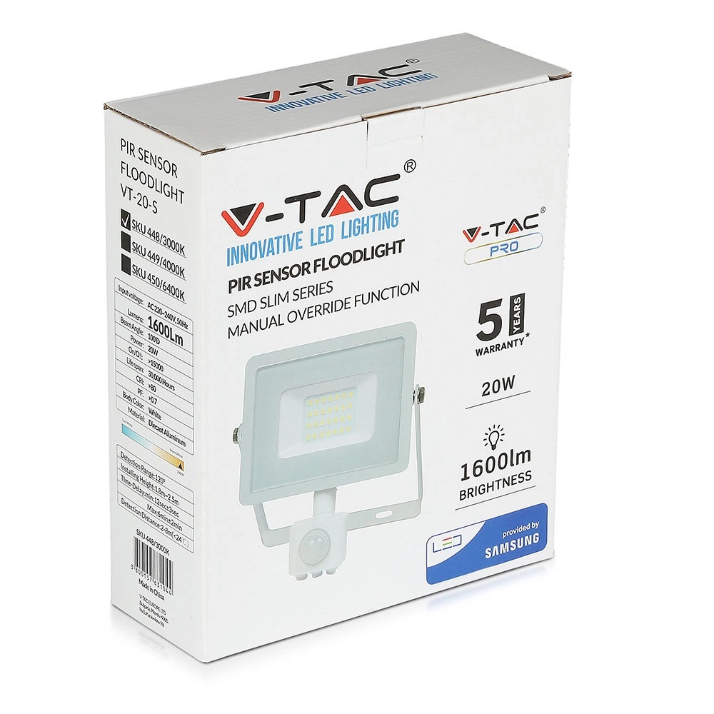 LED světlomet 20W 1600lm 3000K IP65 Bílý s pohybovým senzorem a funkcí CUT-OFF Samsung Chip VT-20-SW V-TAC -