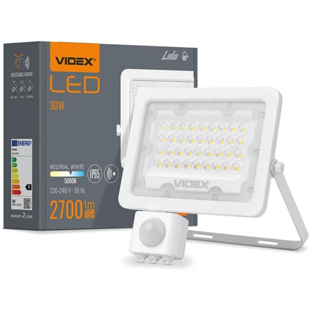 LED světlomet 30W 2700lm 5000K IP65 Bílý se senzorem pohybu a soumraku VIDEO LUCA