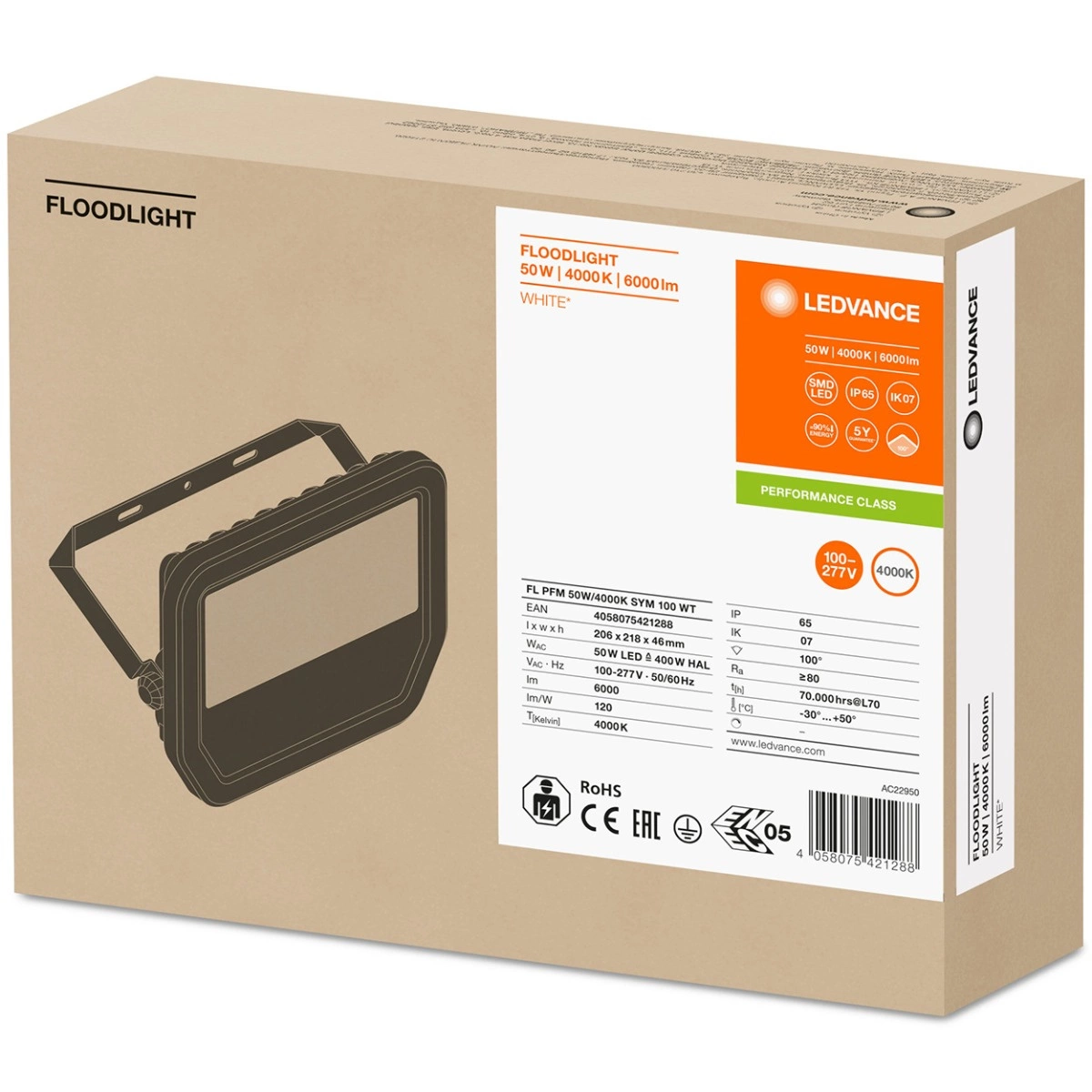 Reflektor LEDVANCE je vybaven energeticky úsporným zdrojem LIGHT LED s výkonem 50 W, vyzařuje neutrální světlo s barevnou teplotou 4000K který umožňuje světelný tok až do hodnoty 6000 lm. Matné tvrzené sklo zajišťuje rovnoměrné rozložení světla. Pro lepší výměnu vzduchu se ve světlometu používá odvzdušňovací ventil, který nemá negativní vliv na stupeň ochrany proti povětrnostním vlivům. LEDVANCE LED halogen je inovativní zařízení pro venkovní použití, které se nejlépe hodí k osvětlení garáží, fasád budov nebo příjezdových cest.