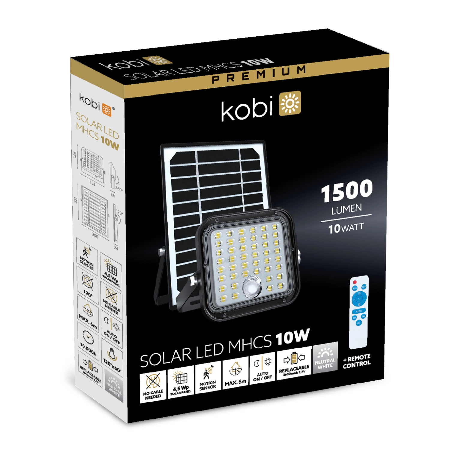 Venkovní solární LED reflektor 10W 1500lm 4000lm neutrální 120° se senzorem pohybu a soumraku IP65 černý MHCS Kobi