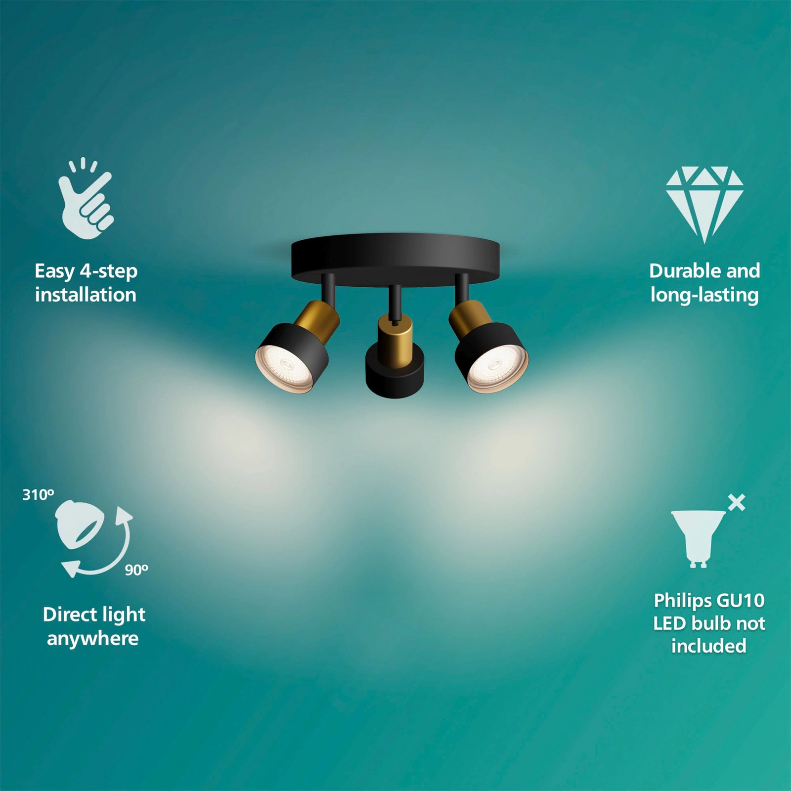 Představujeme vám moderní stropní bodové svítidlo Conduit od společnosti Philips, které dokonale zapadne do každého moderního interiéru. Jedinečný design v černo-měděném barevném provedení mu dodává jedinečný charakter, který jistě upoutá pozornost a obohatí estetiku místnosti. Svítidlo je vybaveno třemi světelnými zdroji typu GU10, které zajišťují optimální osvětlení prostoru.