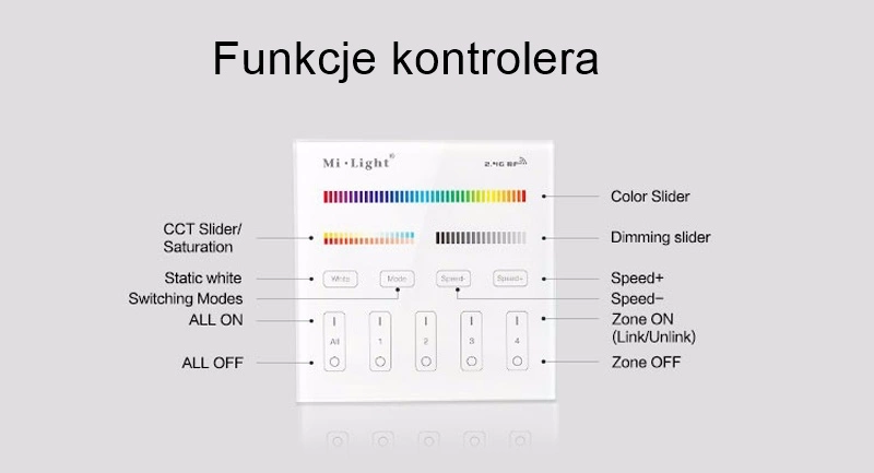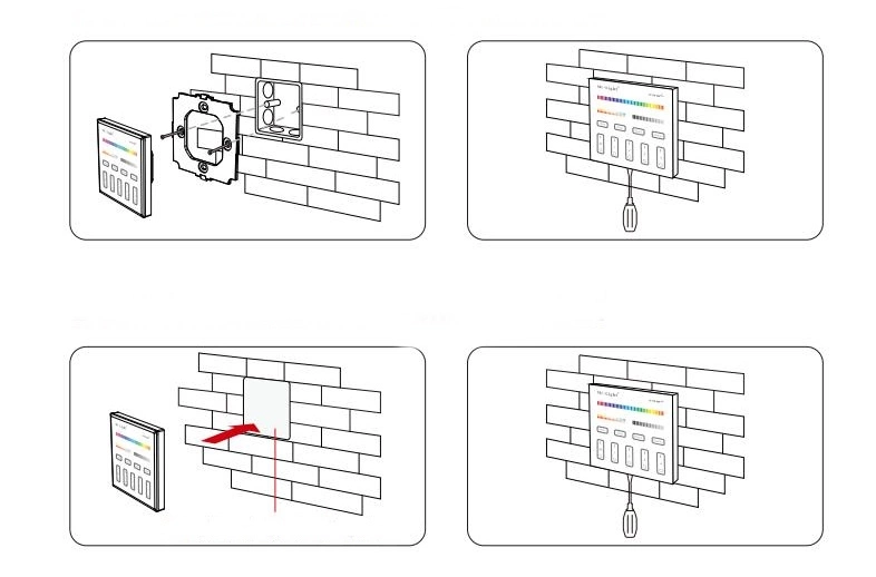 Série nástěnných LED panelů pro zapuštěnou montáž Mi-Light se liší svou strukturou v závislosti na prezentovaném modelu. Mezi nimi je však mnoho souvislých prvků, jako jsou: dotyková ovládací pole, kterým jsou přiřazeny různé funkce. Tlačítko odpovědné za zapnutí/vypnutí LED osvětlení je umístěno v samém středu panelu, aby byl přístup k němu snadný a intuitivní. Pro změnu jasu a teploty barev (v případě CCT ovladačů) slouží dotykový posuvník, také u vícebarevného ovladače RGB, RGB+W nebo RGB+CCT, princip fungování barevných změn zůstává nezměněn. Ovladač se ovládá pomocí číselníku s dotykovými posuvníky uspořádanými v jednotlivých barvách. Zbývající tlačítka slouží specifickým funkcím odpovídajícím danému modelu.