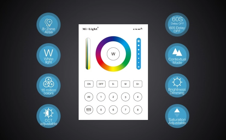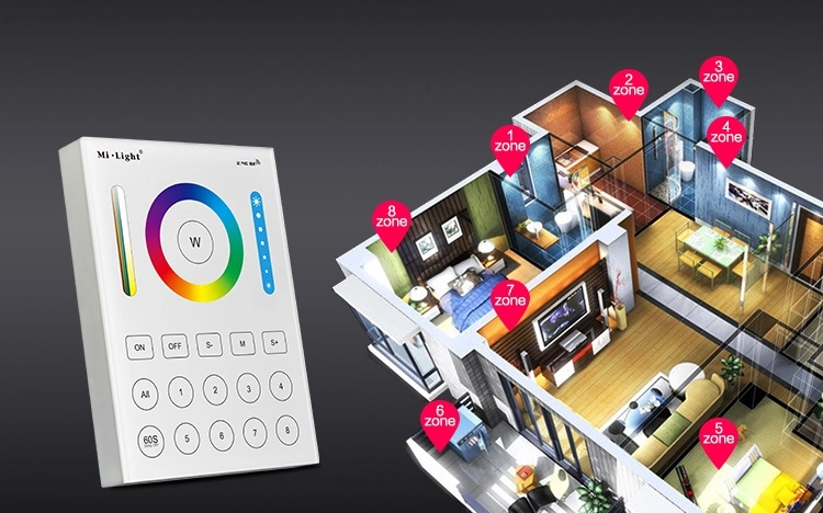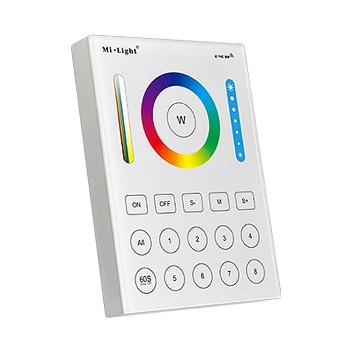 Nástěnný ovladač Mi-Light B8 LED je bezdrátový nástěnný rádiový panel pro instalaci osvětlení RGB+CCT . 8zónové zařízení umožňuje správu jasu s možností nastavení libovolné barvy z palety RGB a variabilní CCT barvu pro zařízení přizpůsobená vícebarevným instalacím jako je RGB+CCT přijímač / žárovky nebo další zařízení z řady Mi-Light. Díky tomuto panelu získáte individuální přístup ke každé ze zón osvětlení ve vašem pokoji, které lze ovládat pomocí nástěnného panelu dotykem. Zařízení je napájeno dvěma 1,5V AAA bateriemi a je určeno pro povrchovou montáž.