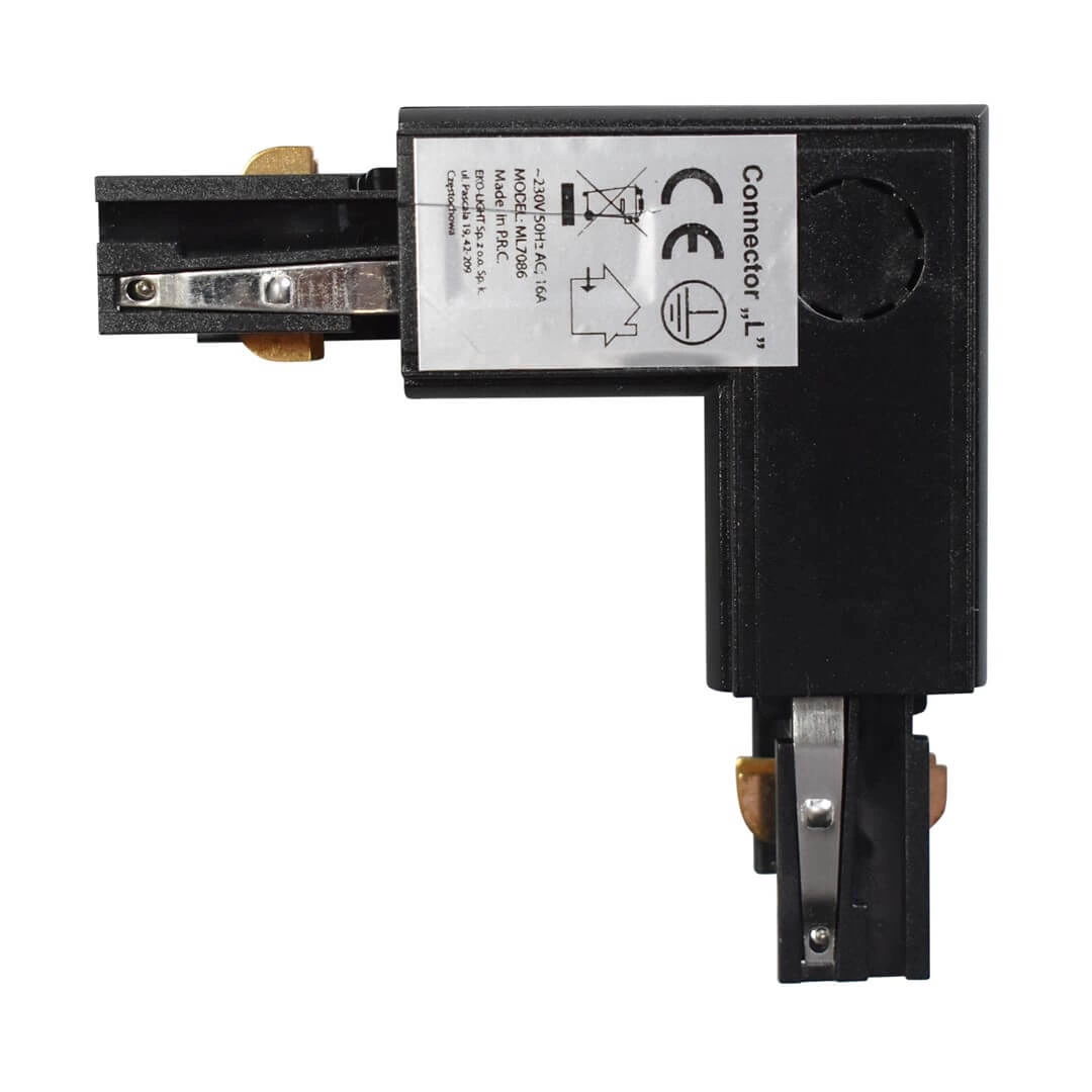 Rohový konektor v černé barvě pro spojení dvou přípojnic pod úhlem 90°. Pomocí konektorů můžete prodloužit kolejnice pro kolejnicová svítidla.