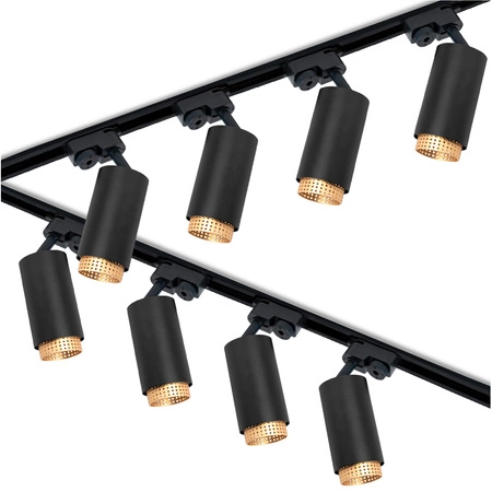 Kompletní sada obsahuje dvě kolejnice, 8 reflektorů a montážní držáky a jednoduchá montáž umožňuje rychlé upevnění celé sady bez použití specializovaného nářadí. Reflektory s paticemi GU10 pracují s LED diodami do 12 W, což vám dává možnost volby barvy a světelného výkonu při nízké spotřebě energie. Moderní černozlatá povrchová úprava a štíhlý válcový tvar v matné černé barvě podtrhují styl industriálních a minimalistických interiérů.