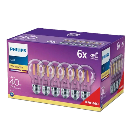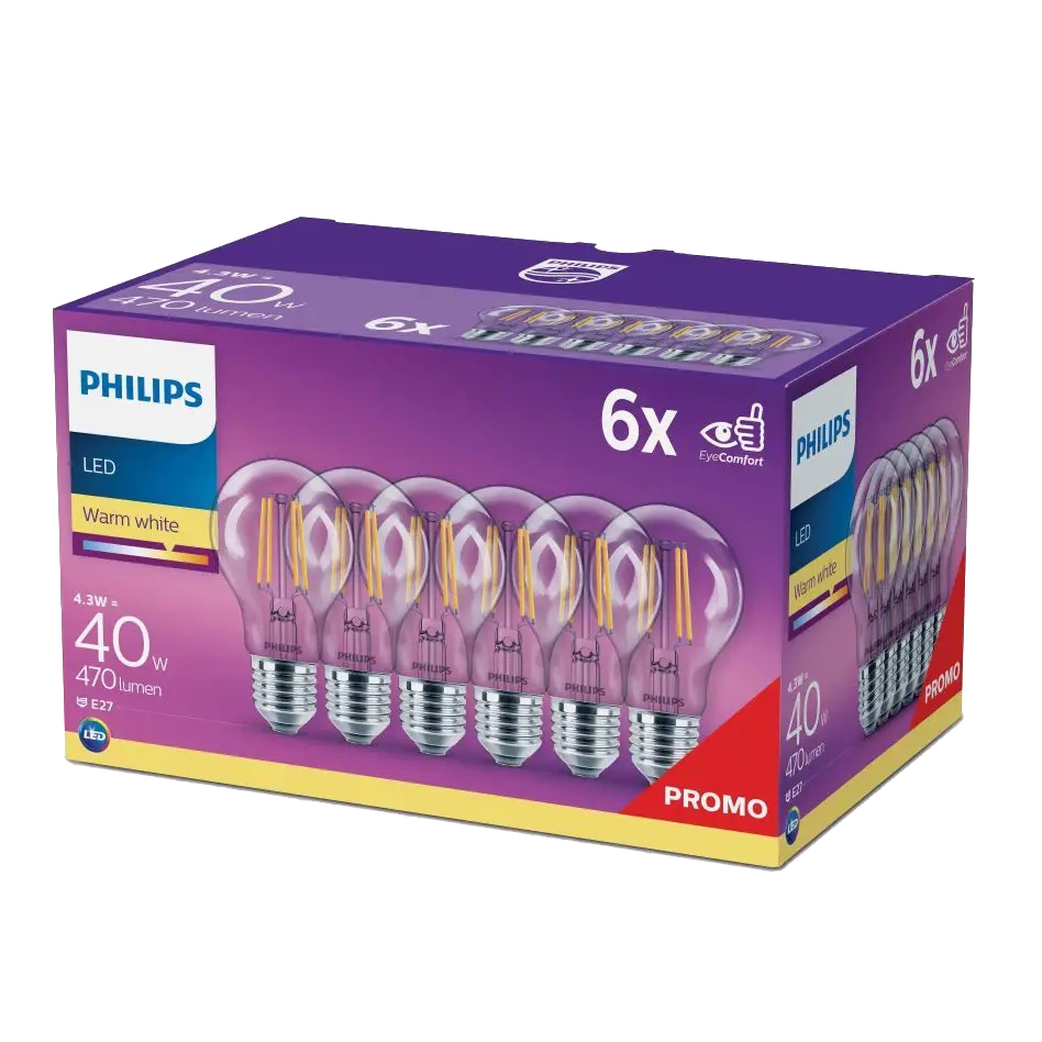 Sada 6x Philips LED žárovky poskytuje teplé světlo, mimořádnou odolnost a okamžité výrazné snížení spotřeby energie. Díky teplé teplotě barev je perfektní volbou pro vytvoření útulné atmosféry. Pro použití např. v koupelně a kuchyni. Spotřebují přibližně o 80 % méně energie než tradiční žárovky díky nejnovější energeticky úsporné LED technologii a mají desetkrát delší životnost. Díky technologii EyeComfort† světlo nezatěžuje oči.