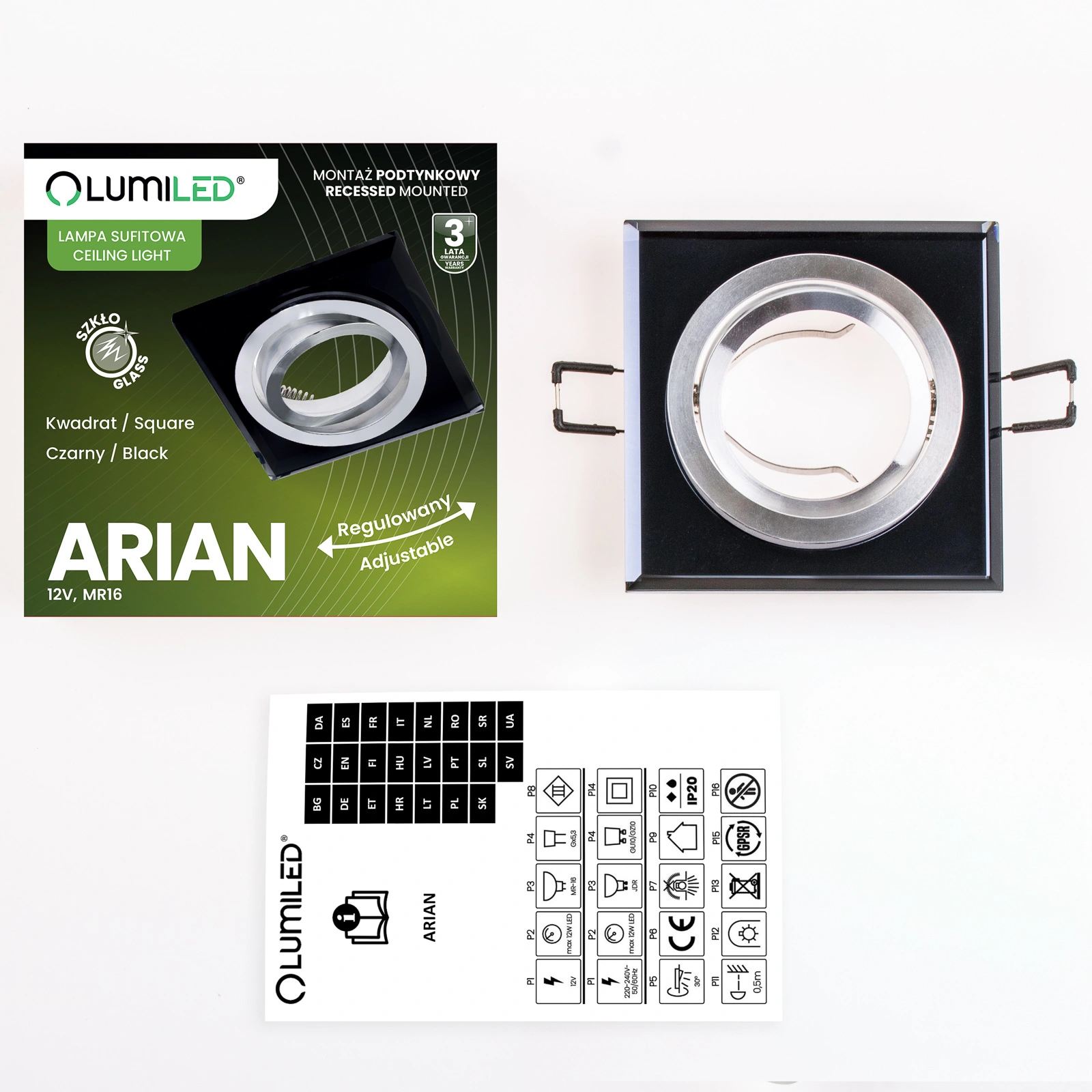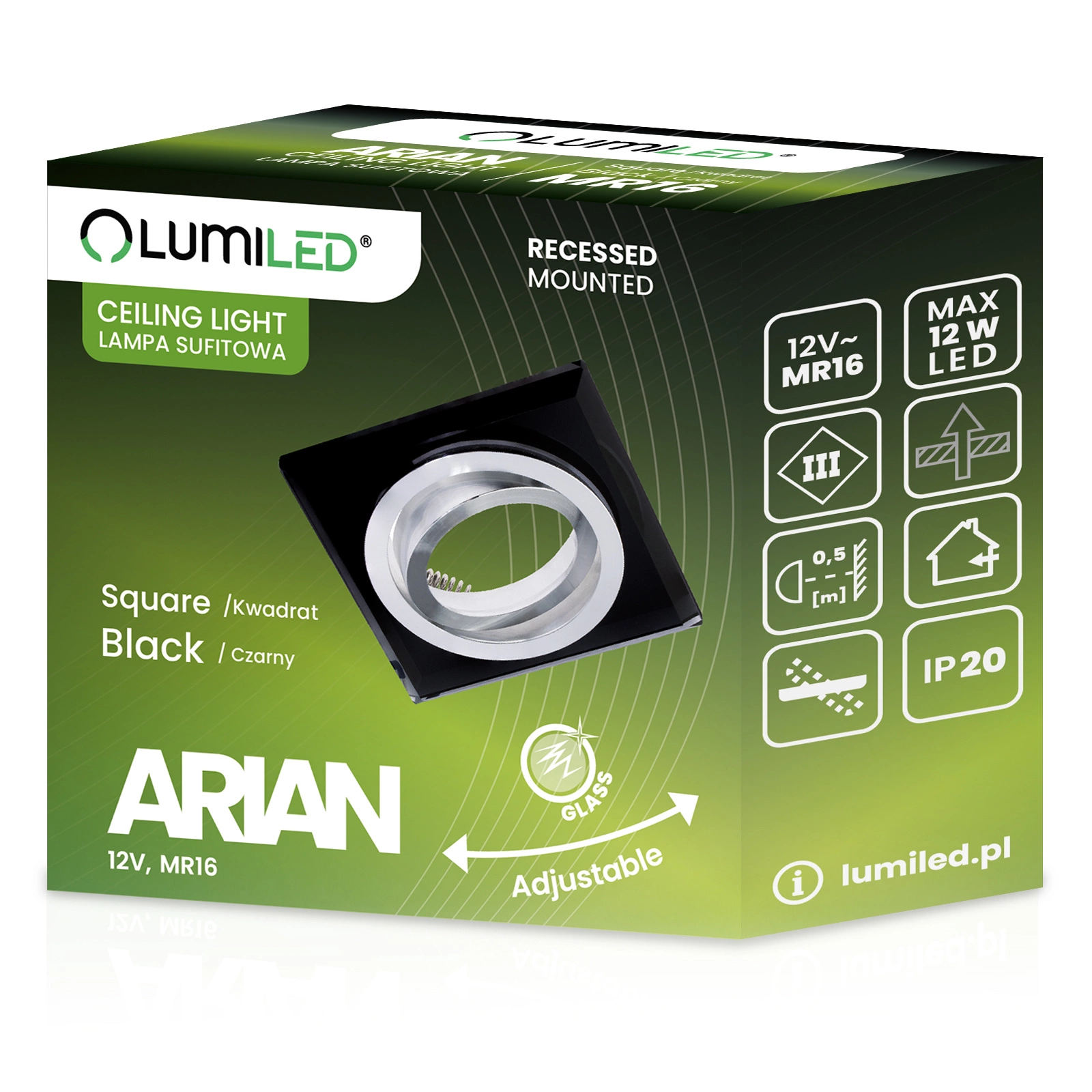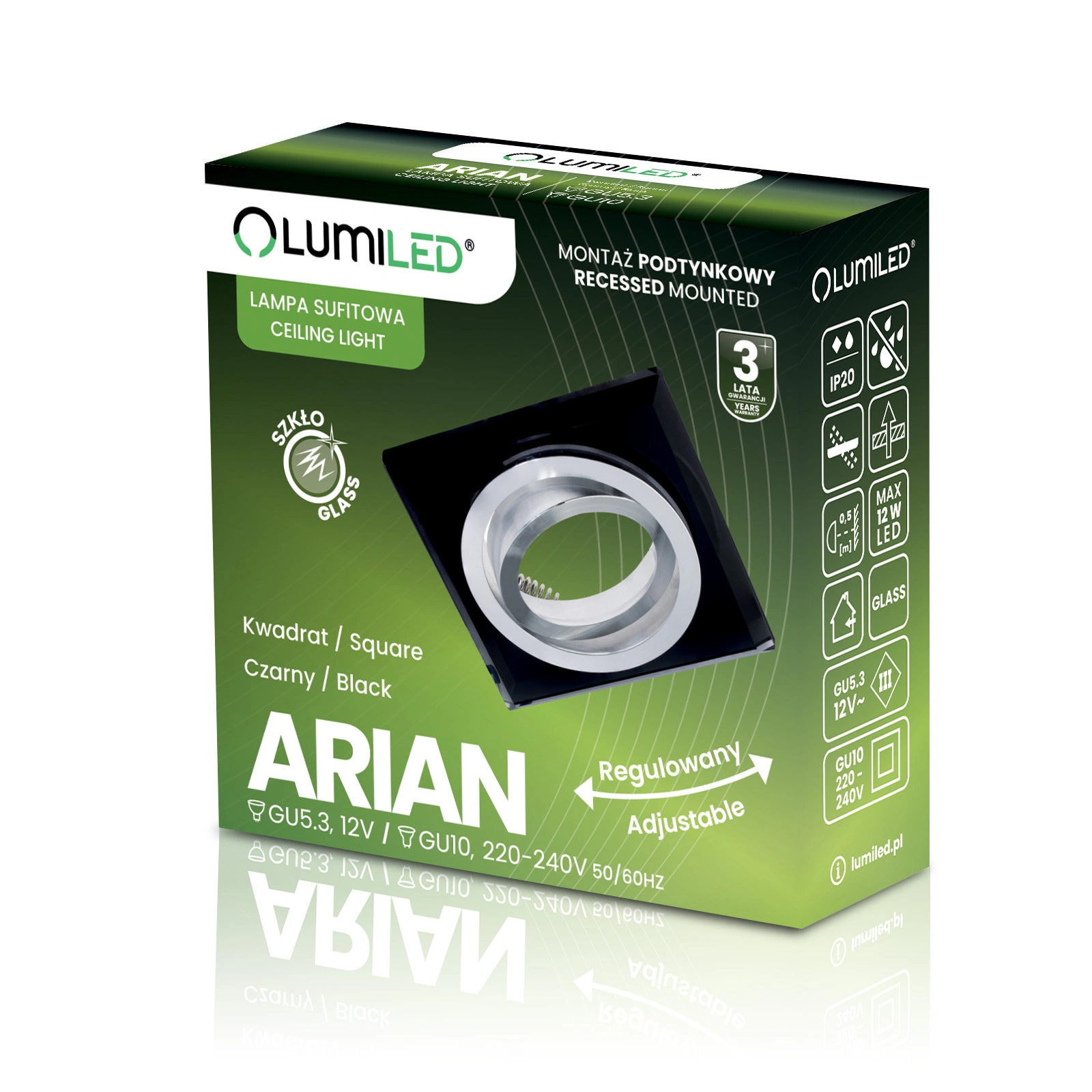 Halogenové svítidlo ze série ARIAN je skleněné svítidlo , které bylo uzpůsobeno pro práci s LED žárovkami s paticí MR16 nebo GU10 . Stropní svítidlo je vyrobeno z kvalitního skla, které se krásně kombinuje se stříbrnými prvky z hliníku. Černé svítidlo se bude skvěle vyjímat v moderních i klasických interiérech. Pohyblivé svítidlo má schopnost nastavit úhel osvětlení , což vám umožní nasměrovat světelný paprsek tam, kde je to potřeba. Čtvercové černé svítidlo bude vypadat úžasně na každém stropě a kombinace několika takových svítidel vám umožní vytvořit dokonalý zavěšený strop.